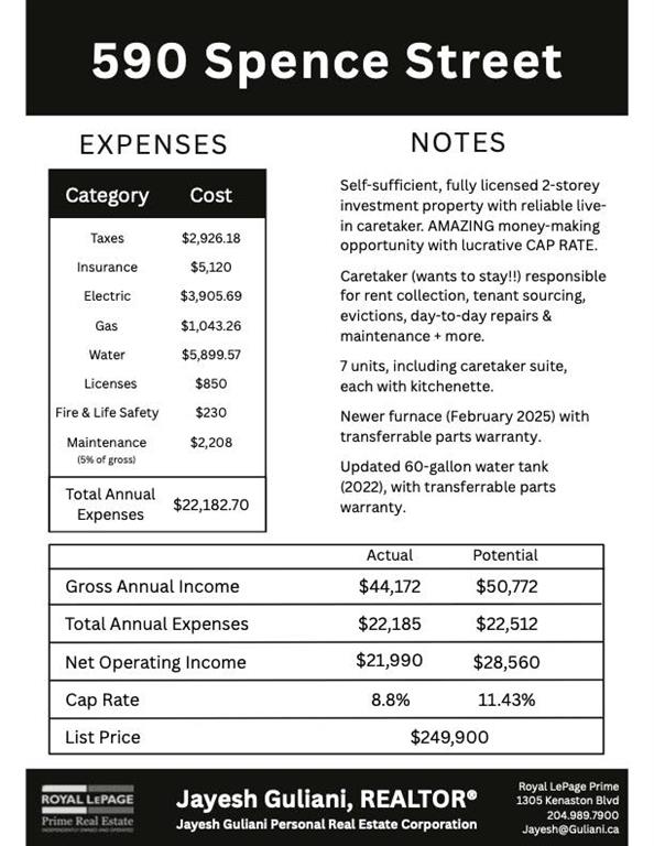 Do you like making money? ASK FOR PROFORMA - $44,172 NET . Potential for $50,772 NET . This highly profitable, self-sufficient, fully licensed investment property in the West End, just mins from the University of Winnipeg, might be exactly what you’re looking for. With 7 units and a reliable live-in caretaker already in place, this is truly a hands-off ownership opportunity. Current caretaker is a jack-of-all-trades who takes immense pride in the property, its tenants, & the neighbourhood. They're responsible for rent collection, tenant sourcing, evictions, day-to-day repairs & maintenance, successful fire safety inspections, & more (and would like to stay). Each unit has its own kitchenette, with shared bathrooms. Plus a 3 bed, 1 bath separate caretaker suite. Backyard is fenced with a secure, gated parking area. The existing tenants have been carefully selected, resulting in a respectful and safe living environment. Recent upgrades incl furnace (25) & 60-gallon water tank (22), both with transferrable parts warranties. If you're looking for a cash-flowing property with a trusted caretaker and a proven track record, this one delivers.