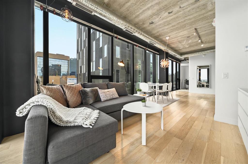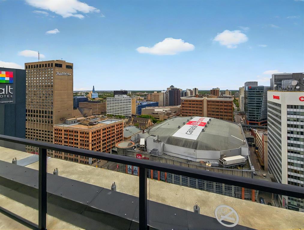 Live at the centre of it all! One of the rare 2-bed, 2-bath suites at Glasshouse Lofts—plus a private balcony and the option to purchase fully furnished! This 822 sqft unit blends modern edge with warm comfort: exposed concrete ceilings, floor-to-ceiling windows, engineered hardwood floors, and a streamlined kitchen with stone counters and built-in appliances. Both bedrooms offer great closet space, and the second full bath is ideal for guests or shared living. Enjoy 5-star amenities including a full gym, theatre room, rooftop terrace with BBQs, firepits, and cabanas, plus an indoor lounge with kitchen, bar, and pool table. Glasshouse connects you directly to True North Square, Canada Life Centre, and more via the Skywalk—so you can catch a Jets game without putting on a parka. Pet-friendly, with in-suite laundry and private storage included. This is bold, stylish downtown living with unbeatable access and energy.