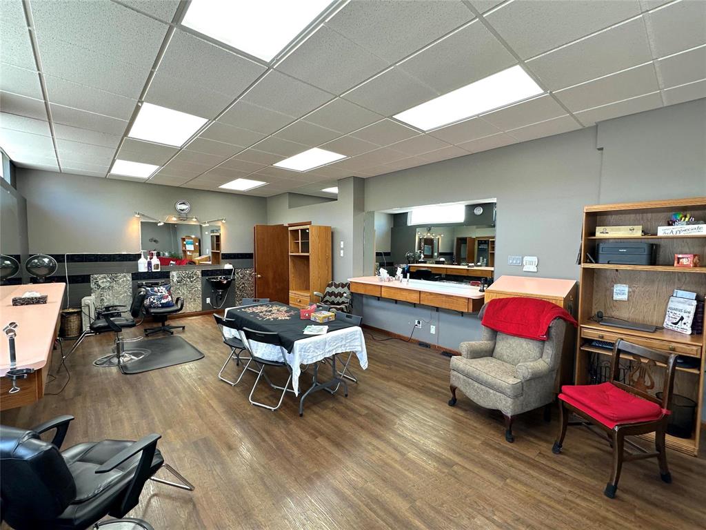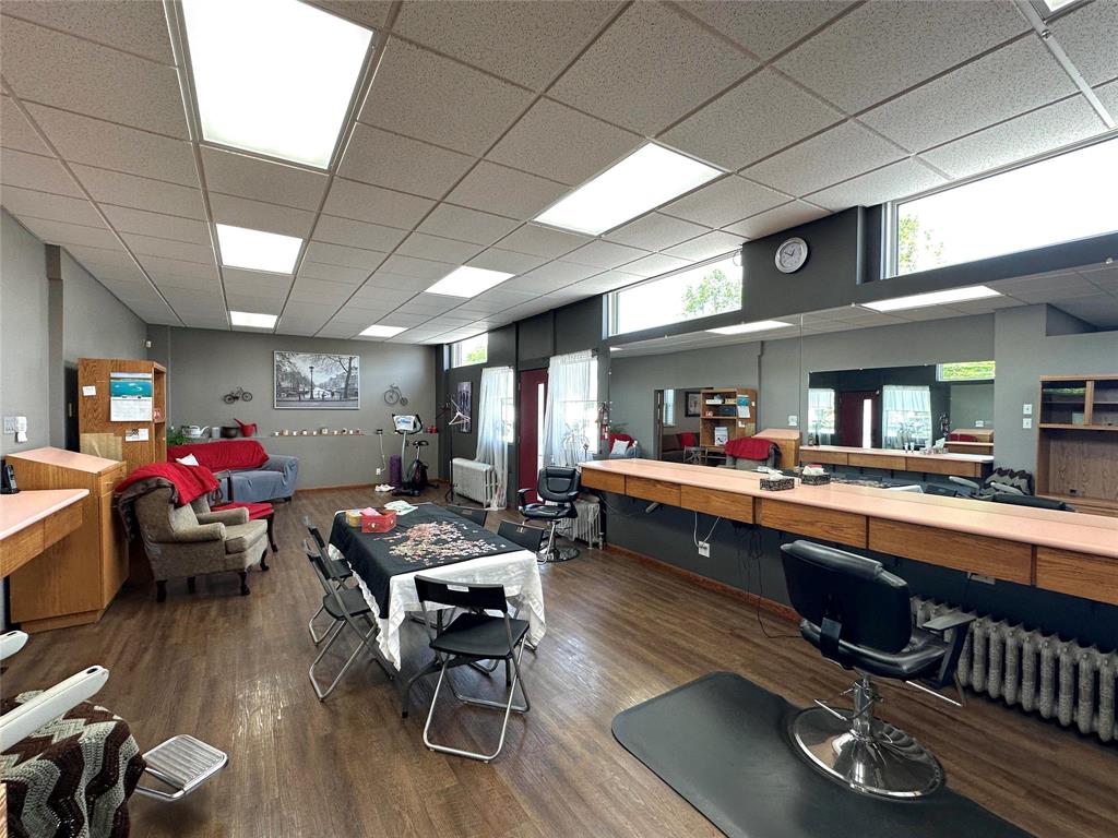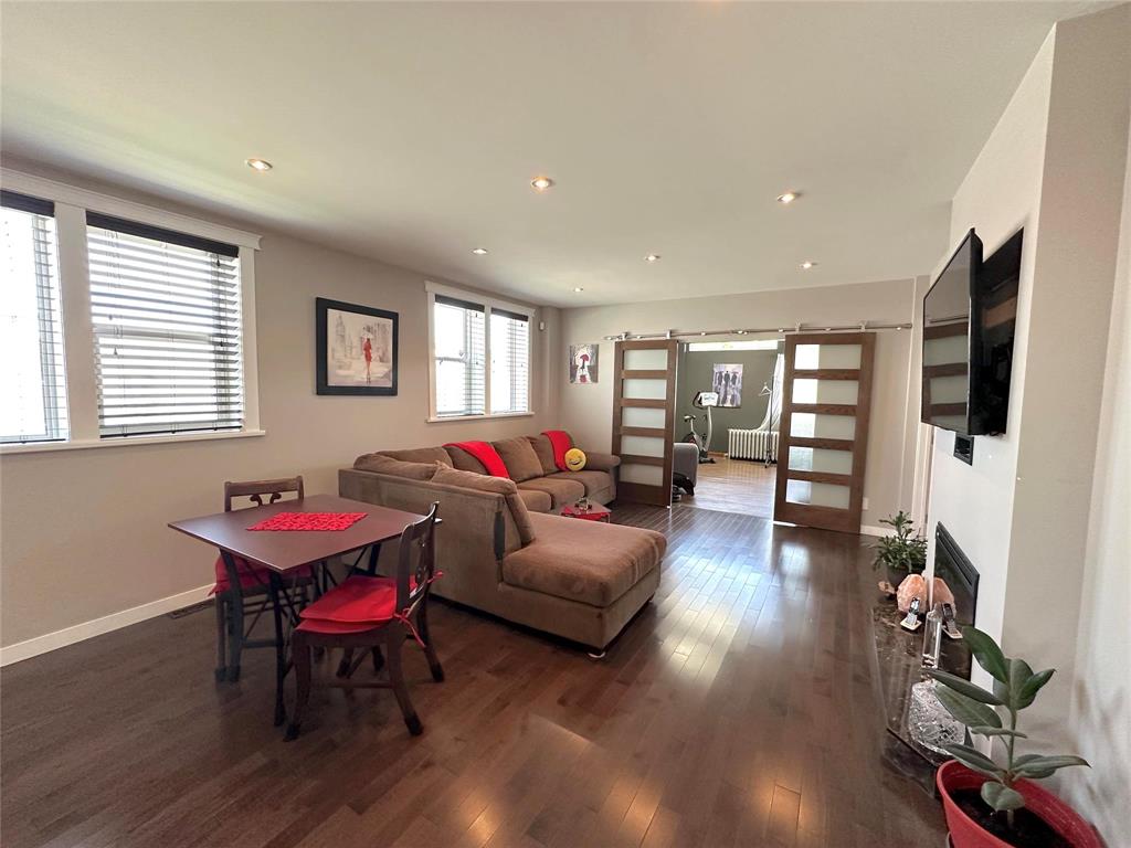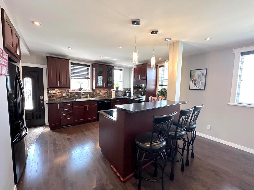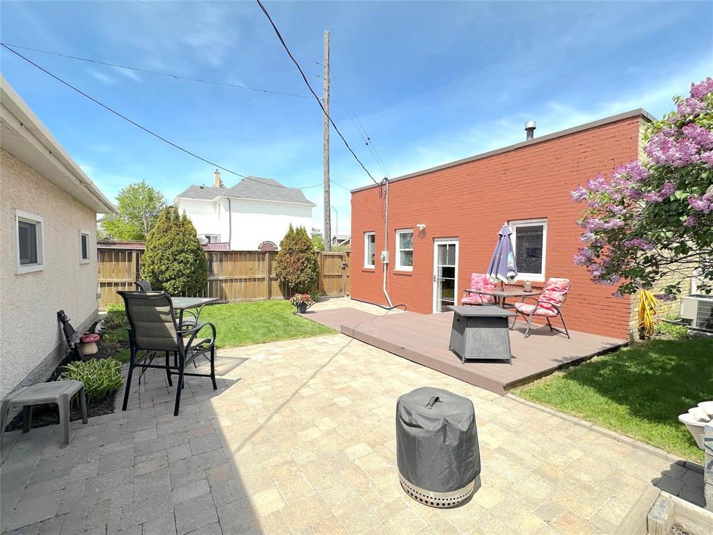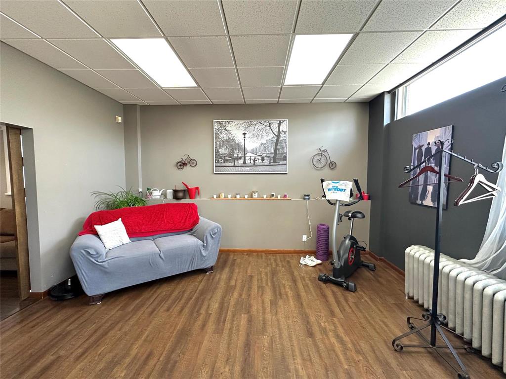 S/S Fri. July 11. Offers reviewed Mon., July 14, 7 pm. Impressive from the moment you arrive in this beautiful, turn-key home! Bright, open-concept layout, living area w/hardwood floors, living room w/electric fireplace, sliding barn doors to 15' x 36.5' front flex space with endless possibilities. Cherrywood kitchen w/built-in oven, microwave, dishwasher, under-cabinet lighting, appliance cabinet, 2 tier island w/built-in cooktop, sink, overhead lighting, bar top, dining area. Huge 11.5'x16.5' bedroom w/glass pendant lighting, access to luxurious spa-like bathroom, floor-to-ceiling ceramic tile, glass walk-in shower w/rain & handheld shower heads, 2 person whirlpool tub with air/jet features. Main floor laundry, 1 full bath, 2 half baths. Fully fenced yard, 11.5'x11.5' composite deck, 12'x21.5' stone patio & walkway, o/s 16'x33' garage w/storage, workshop/lounging space. Low maintenance brick & stucco exterior, newer front windows & door, updated furnace, c/air, spray foam insulation in main living area. Was previously a hair salon, purchaser to do their own due diligence regarding commercial use. Full basement except under former salon area. Close to schools, public transportation, shopping & more!