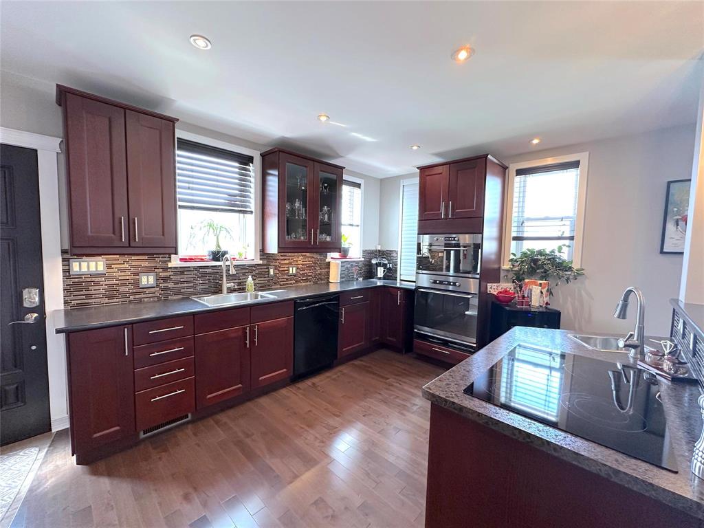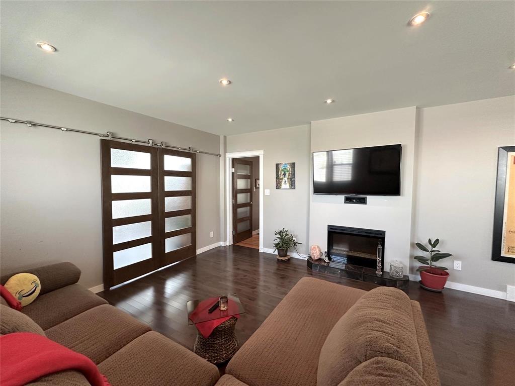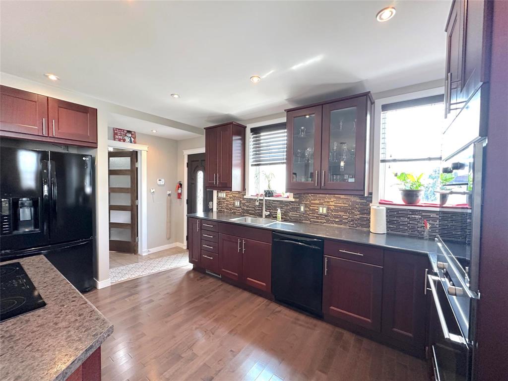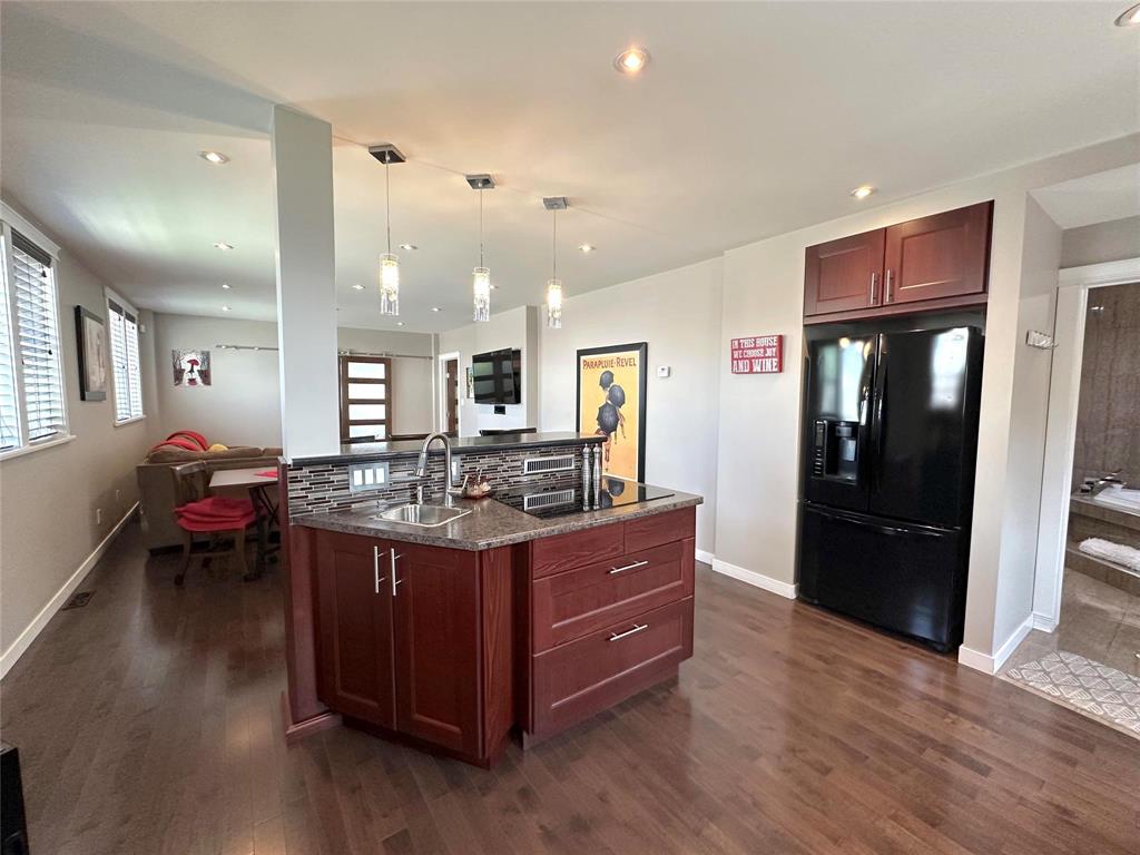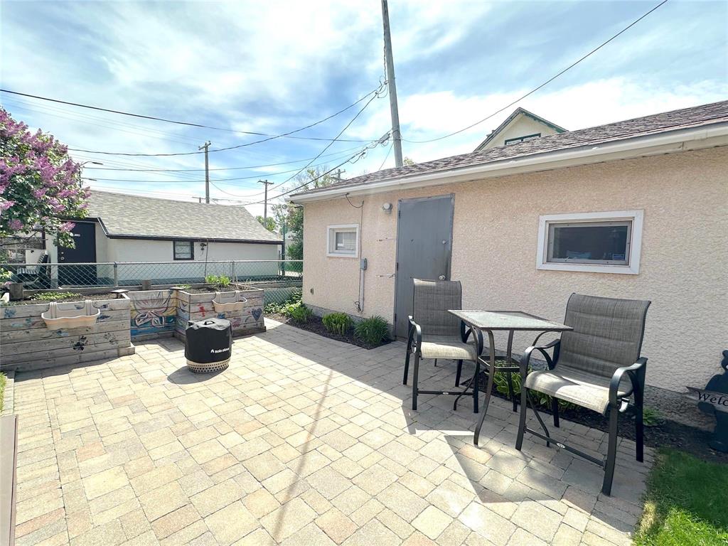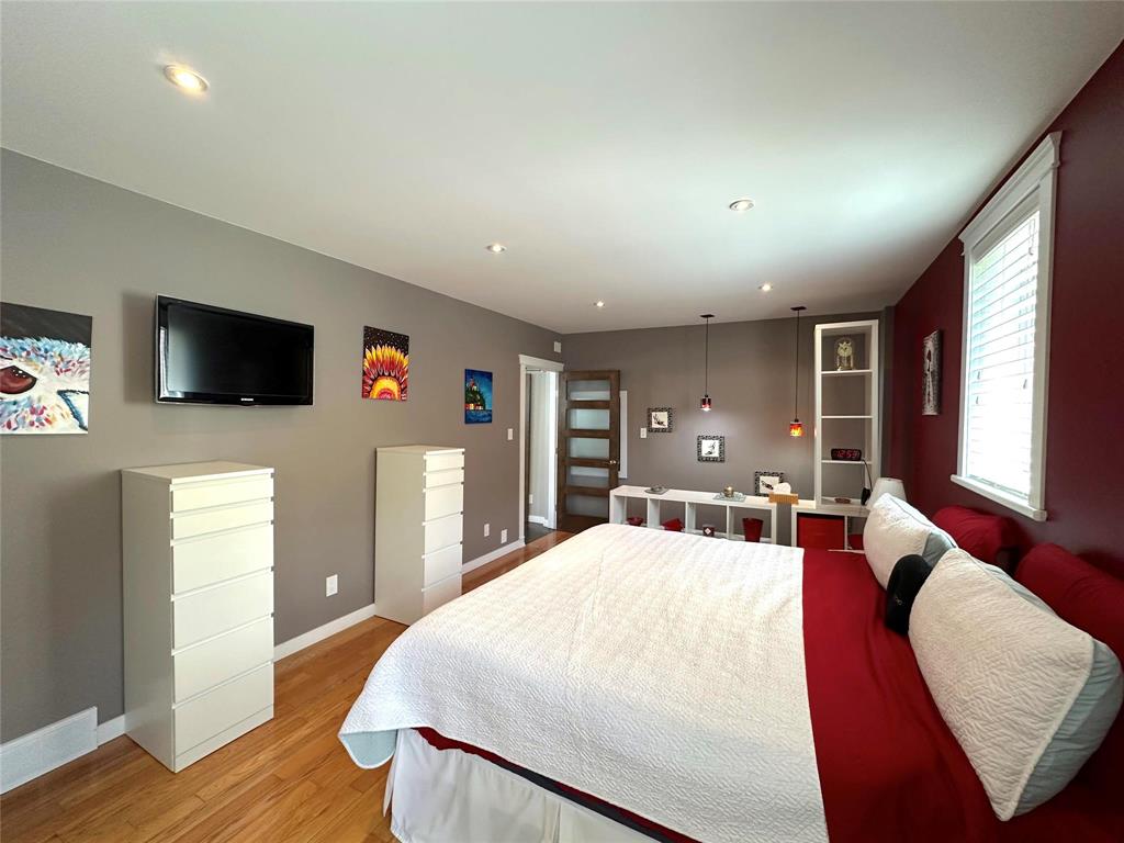 S/S Fri. July 11. Offers reviewed Mon., July 14, 7 pm. Impressive from the moment you arrive in this beautiful, turn-key home! Bright, open-concept layout, living area w/hardwood floors, living room w/electric fireplace, sliding barn doors to 15' x 36.5' front flex space with endless possibilities. Cherrywood kitchen w/built-in oven, microwave, dishwasher, under-cabinet lighting, appliance cabinet, 2 tier island w/built-in cooktop, sink, overhead lighting, bar top, dining area. Huge 11.5'x16.5' bedroom w/glass pendant lighting, access to luxurious spa-like bathroom, floor-to-ceiling ceramic tile, glass walk-in shower w/rain & handheld shower heads, 2 person whirlpool tub with air/jet features. Main floor laundry, 1 full bath, 2 half baths. Fully fenced yard, 11.5'x11.5' composite deck, 12'x21.5' stone patio & walkway, o/s 16'x33' garage w/storage, workshop/lounging space. Low maintenance brick & stucco exterior, newer front windows & door, updated furnace, c/air, spray foam insulation in main living area. Was previously a hair salon, purchaser to do their own due diligence regarding commercial use. Full basement except under former salon area. Close to schools, public transportation, shopping & more!