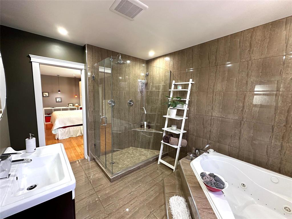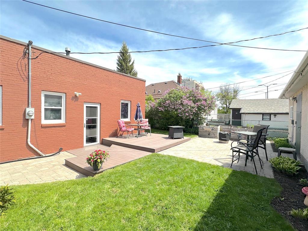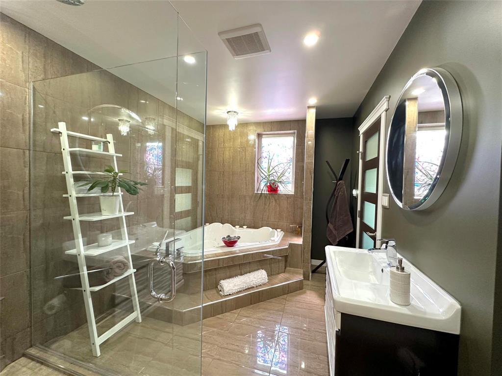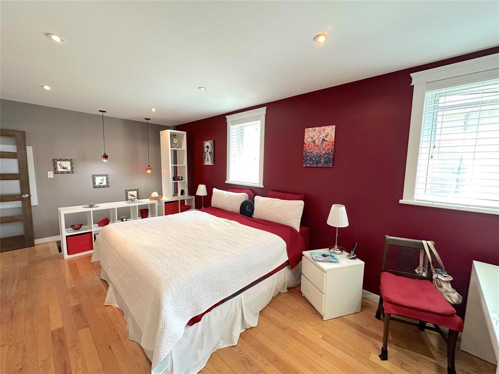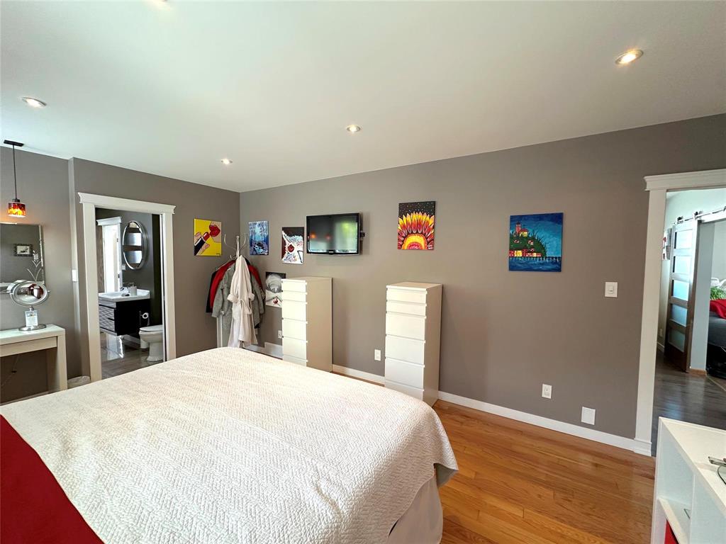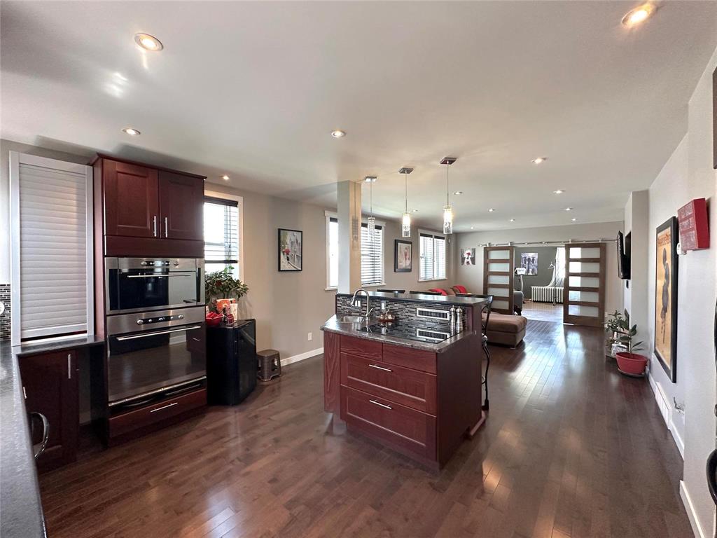 S/S Fri. July 11. Offers reviewed Mon., July 14, 7 pm. Impressive from the moment you arrive in this beautiful, turn-key home! Bright, open-concept layout, living area w/hardwood floors, living room w/electric fireplace, sliding barn doors to 15' x 36.5' front flex space with endless possibilities. Cherrywood kitchen w/built-in oven, microwave, dishwasher, under-cabinet lighting, appliance cabinet, 2 tier island w/built-in cooktop, sink, overhead lighting, bar top, dining area. Huge 11.5'x16.5' bedroom w/glass pendant lighting, access to luxurious spa-like bathroom, floor-to-ceiling ceramic tile, glass walk-in shower w/rain & handheld shower heads, 2 person whirlpool tub with air/jet features. Main floor laundry, 1 full bath, 2 half baths. Fully fenced yard, 11.5'x11.5' composite deck, 12'x21.5' stone patio & walkway, o/s 16'x33' garage w/storage, workshop/lounging space. Low maintenance brick & stucco exterior, newer front windows & door, updated furnace, c/air, spray foam insulation in main living area. Was previously a hair salon, purchaser to do their own due diligence regarding commercial use. Full basement except under former salon area. Close to schools, public transportation, shopping & more!