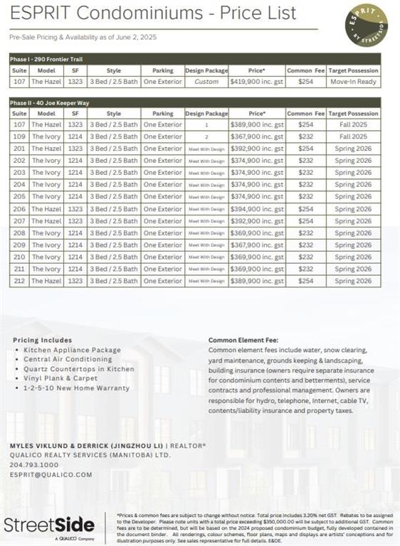 Affordability. Location. Function. Streetside's latest townhouse community is well located in family friendly, Bison Run - only 300 meters away from Winnipeg's 2 newest schools, and a mega, upcoming rec centre! Your 3 bedroom, 2+1/2 bath home features an island kitchen with backsplash and quartz on LVP flooring, all appliances (except W/D) air conditioning and more! Enjoy the second level main bedroom with ensuite, walk-in closet and flex space for your home office work station. Move soon, its ready!! Discover Bison Run, a master planned communty thats super close to UofM and amenities galore. Note this suite has a water meter which is hidden by a built-in cabinet in the living area. (Pictures taken from display suite for reference only).