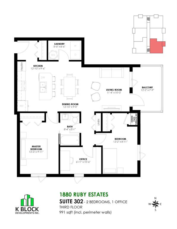 This is the largest suite in the building with 2 bedrooms + office and features a spacious entry leading to the galley style kitchen with large island overlooking the open concept dining room and main living area.