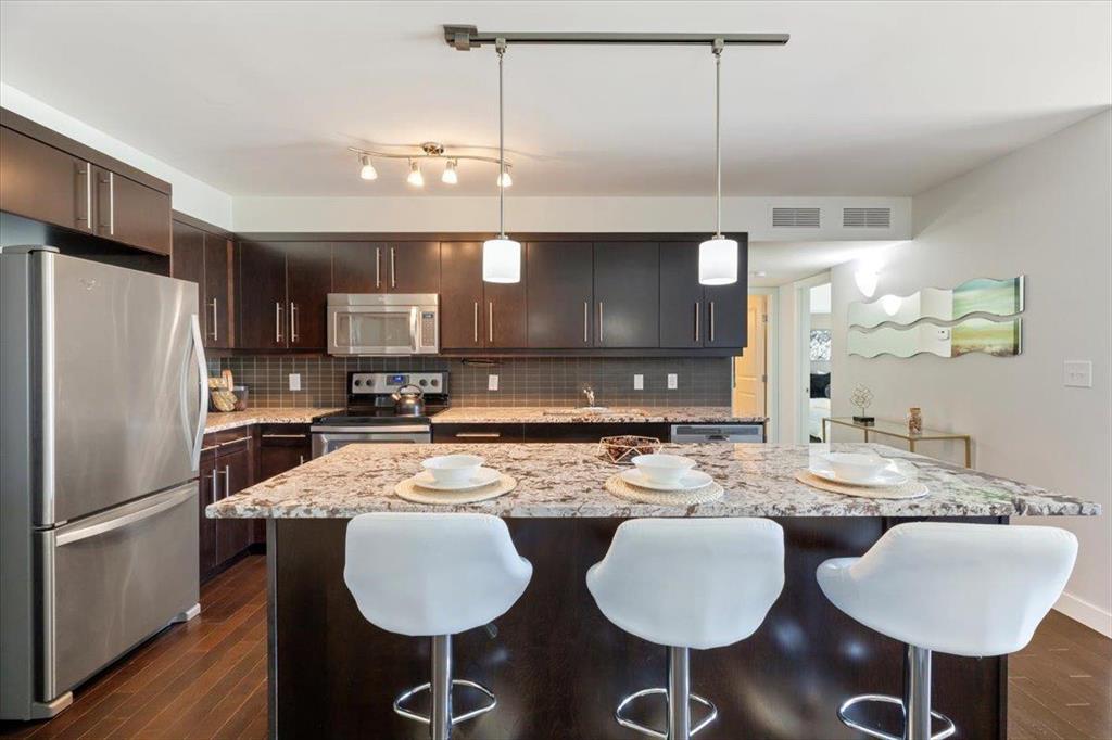 Located on the top floor, enjoy breathtaking sunset views from your private, west-facing balcony, complete with a convenient attached storage unit. Inside, you’ll find a spacious, modern layout with in-suite laundry, an open-concept living area with custom cabinets, granite countertops, stainless steel appliances & an electric fireplace to keep you warm on those cool winter nights.