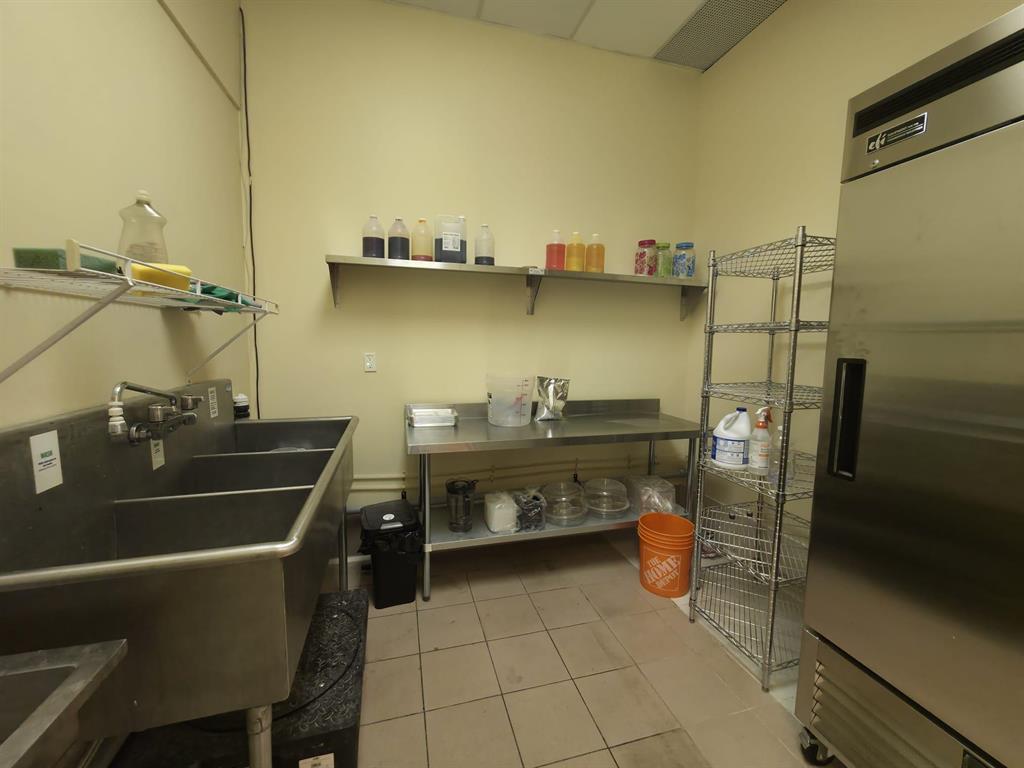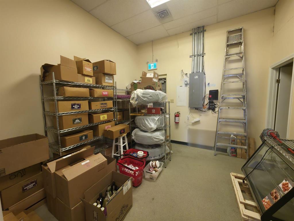The unit features a clean, modern interior with a furnished kitchen, triple sink, prep area, freezer, exhaust system, and a dedicated employee washroom—perfectly set up for a café, food service, or specialty retail business.
