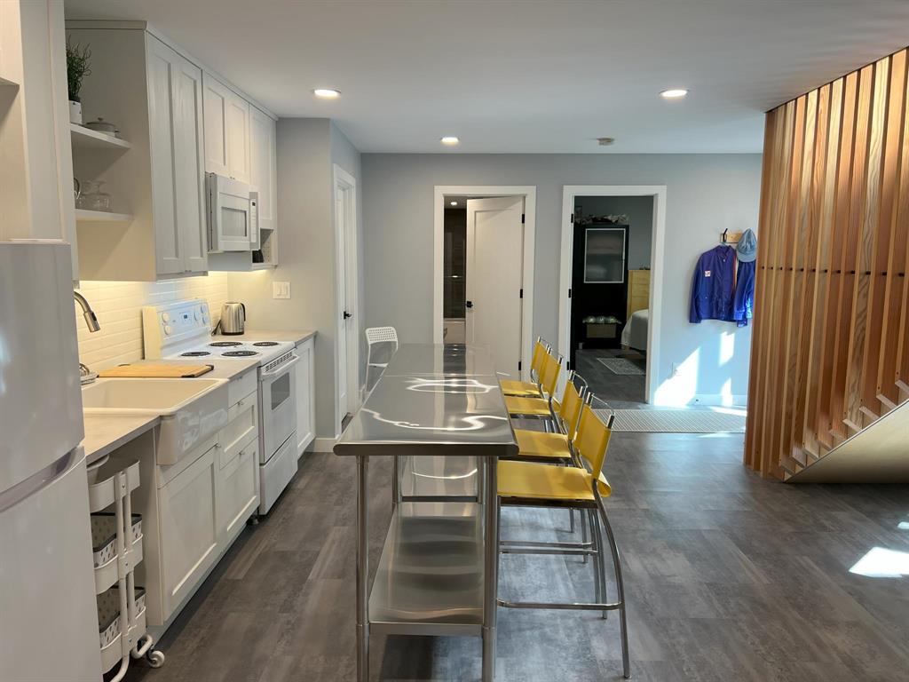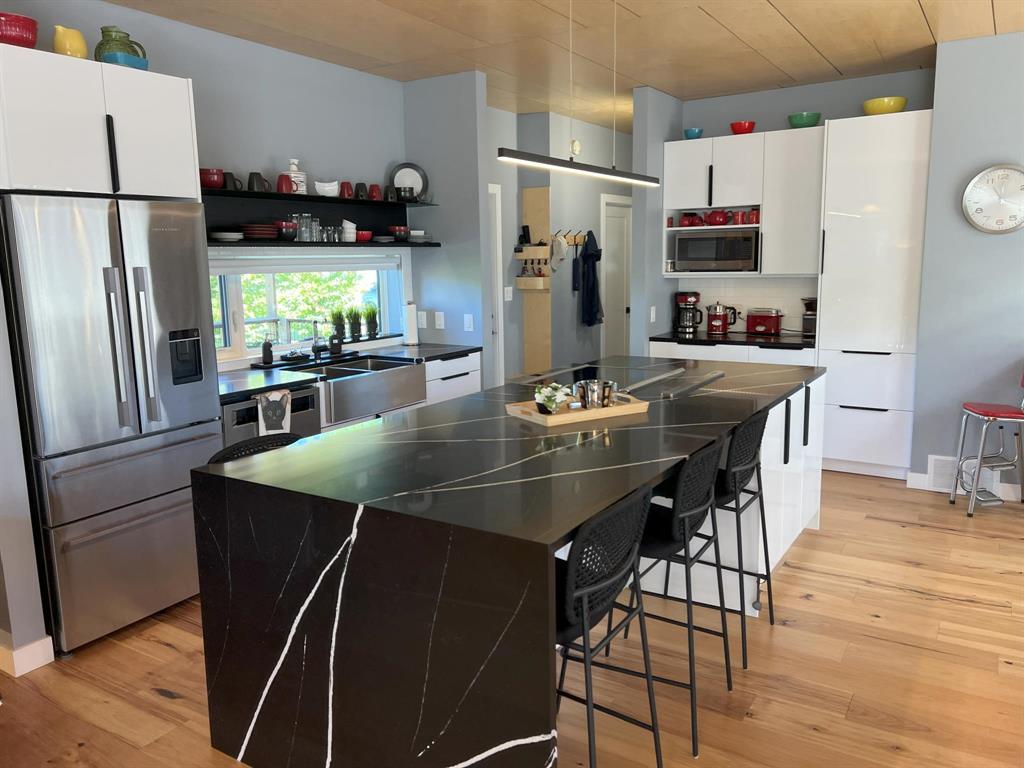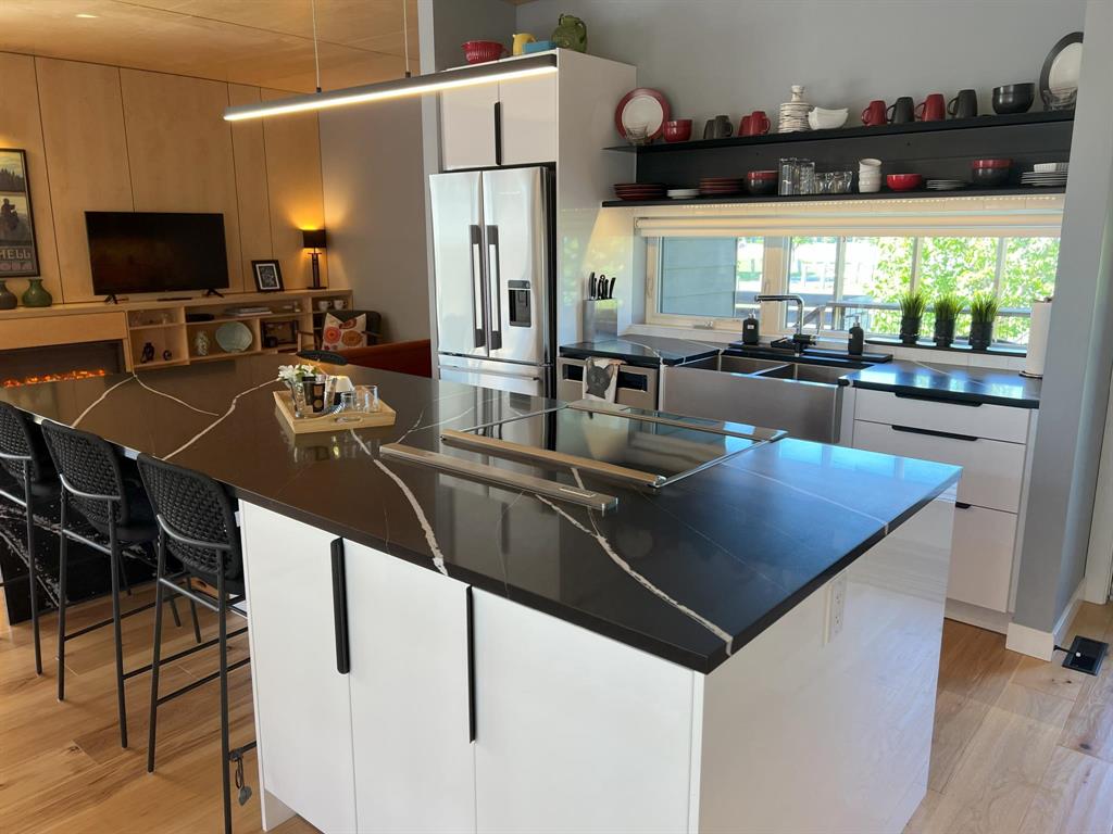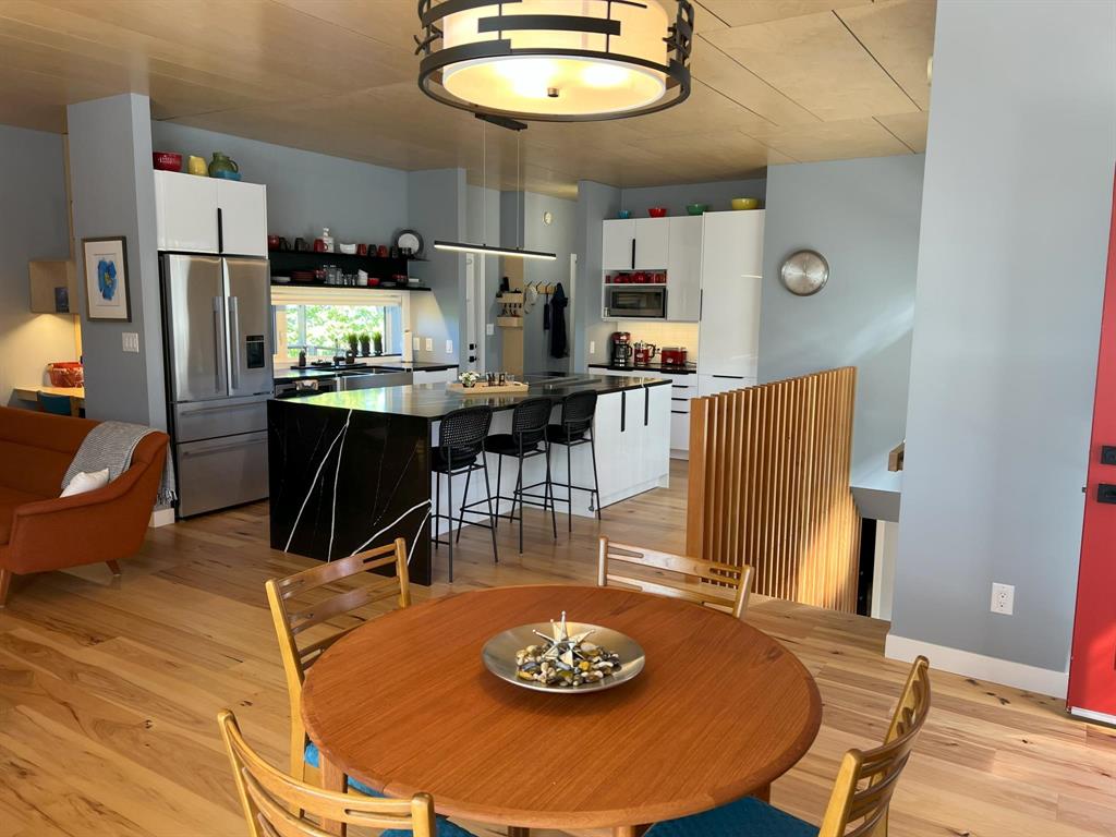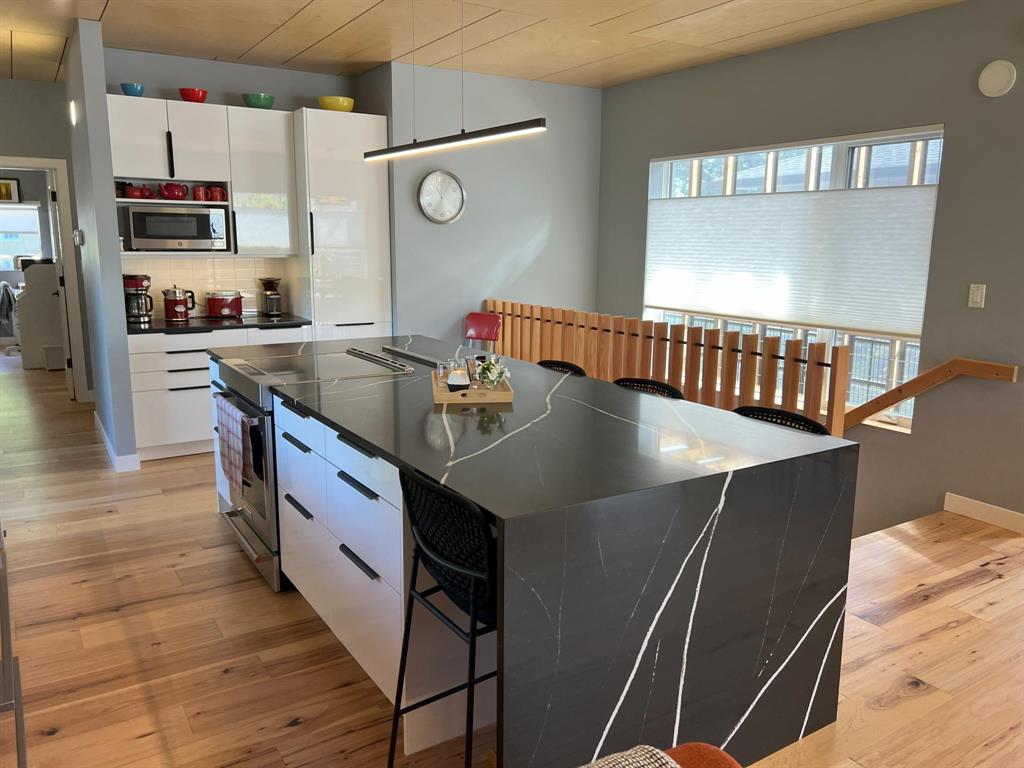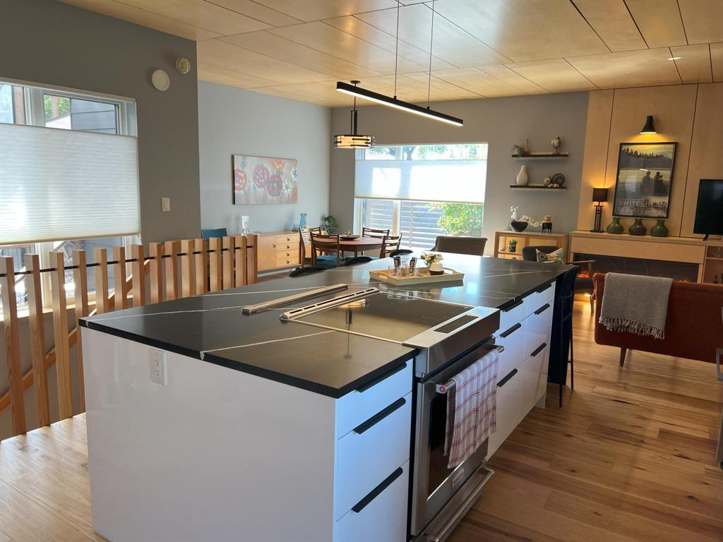 This modern, incredibly custom designed 4 bedroom, 3 full bathroom Scandinavian style home is built with great attention to detail & high quality finishes. Enjoy the spacious 1200sf main level with gorgeous open-concept living room, dining area, and kitchen with a huge island, quartz counter, and built-in media wall! Main floor features blonde hickory flooring & blonde birch ceiling. The primary bedroom has a beautiful ensuite with 2 sinks, tub & walk-in shower. The fully finished lower level has 2nd full kitchen, family area, 2 more bedrooms, and a full bathroom with 2 sinks. Unique basement walkout leads to private patio, low-maintenance urban oasis, complete with decking & landscaping. Both the home & garage are surrounded with an attractive Hardie board & steel roof exterior. 22x20 detached garage with 18ft overhead door. Located near to shopping, parks and walking paths!