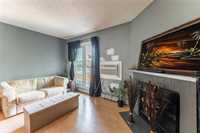 Inside, you’ll find a bright and functional layout with an open-style kitchen, a formal dining space, and a cozy sunken living room with a wood-burning fireplace. Patio doors lead out to a spacious covered balcony, perfect for relaxing with views of the green space.