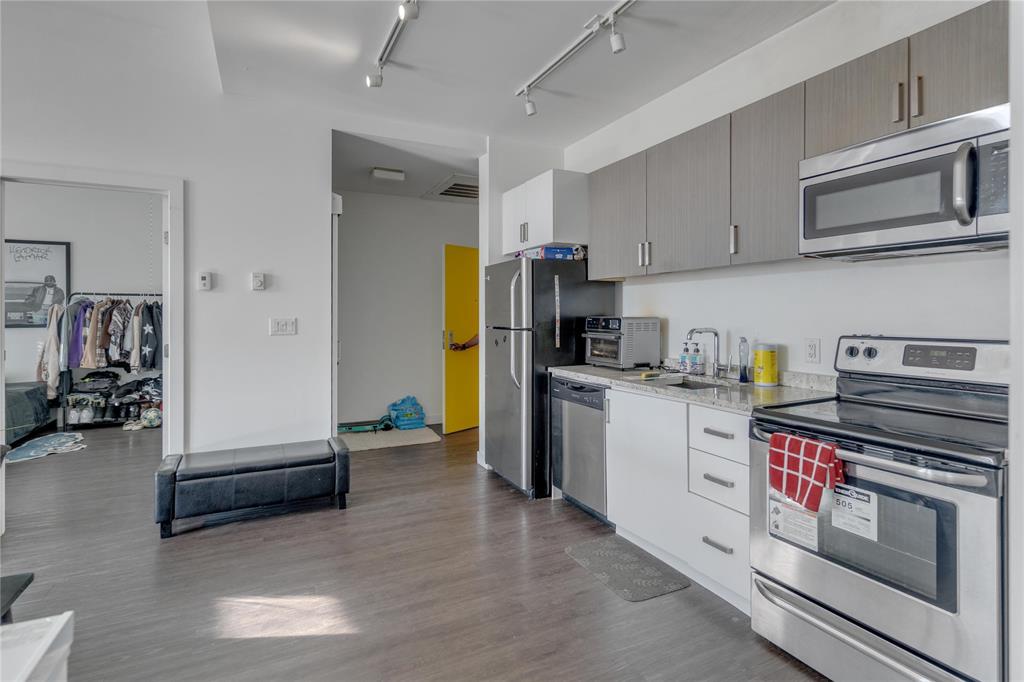 The building is packed with amenities: in-suite laundry, a gym, rooftop patio, two elevators, heated underground parking, secure bike storage, and excellent soundproofing (STC 60). Condo fees also cover water and professional management.