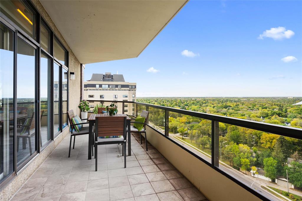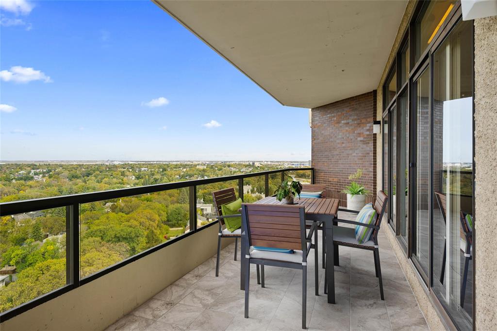 Remarkable 2562 SF Penthouse w breathtaking views over the park.Perfect location in Old Tuxedo, walking distance to all amenities, coffee shops, supermarket & Assiniboine Park. Elegance defines this beautiful residence. Enter through double ebony-stained doors into a large foyer with 2-pc bath adjacent. Designer details throughout, floor to ceiling windows, dark stained wood floors, amazing amount of natural light. The stunning living room is ideal for entertaining. The dining room features a built-in serving buffet & display shelving showcases treasures in the living room. Custom kitchen features an island, separate eating area, double ovens, stone counters. Huge laundry room appointed with newer washer & dryer, sink & great storage. The Sumptuous primary suite has 2 walk in closets & spacious 4-pce ensuite with large shower. The 2nd bedroom features built in Murphy beds, 3 pc ensuite & access to the heated solarium. The versatile solarium can be used as a den, extra bedroom, office, or gym. The building amenities include storage lockers, two heated underground parking spots, valet parking, 24 hr concierge/security. This is condo living at its finest.