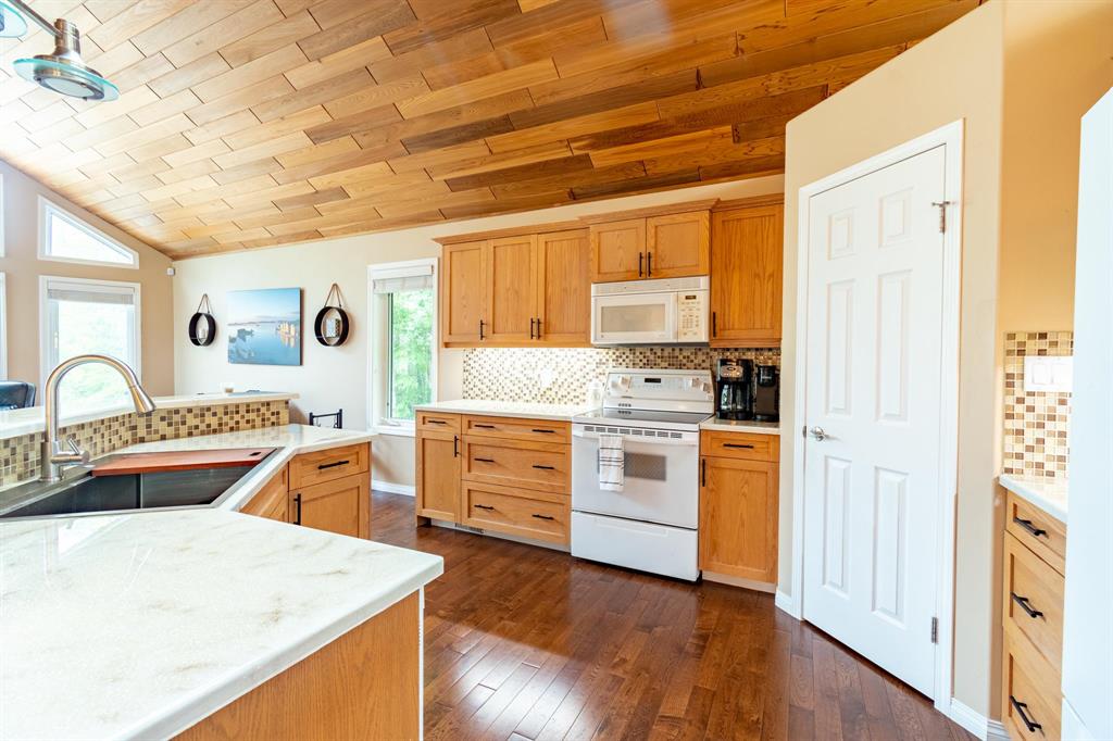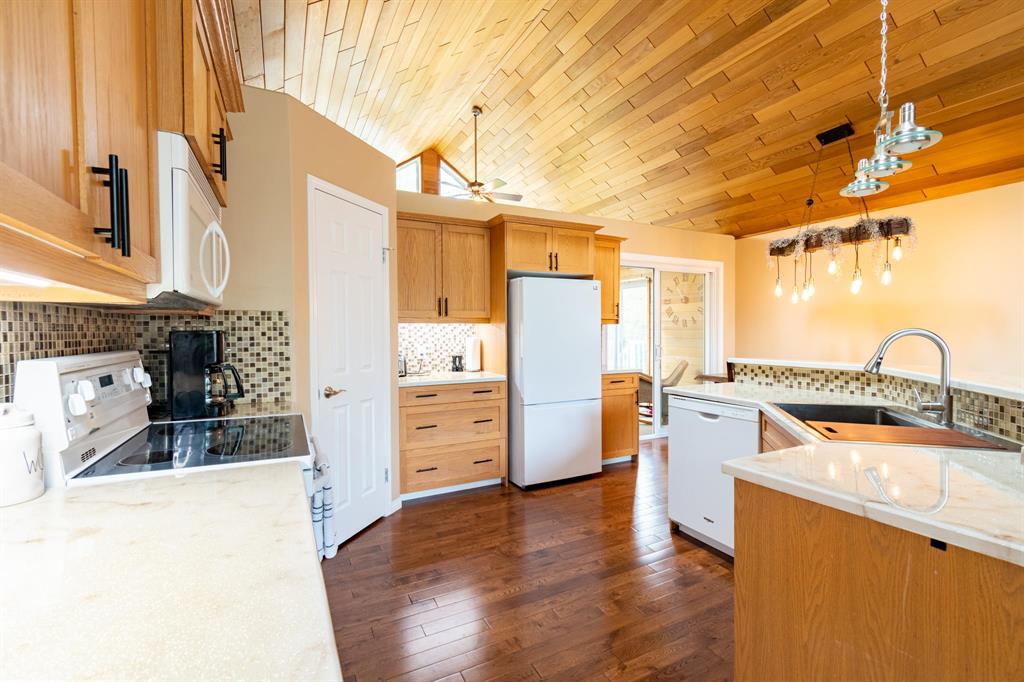 NEW PRICE! | 19th Hole Hideout | Offers as rec'd | Welcome to this beautifully maintained 4 season, 2 bedrm, 2 bathrm bungalow nestled in Grand Pines Golf Course, minutes from Hillside Beach, Albert Beach & Rem’s Beach in Traverse Bay. This home offers the perfect blend of comfort, recreation & relaxation. Step inside to an open concept living space featuring 14’ cedar cathedral ceilings & a bright oak kitchen updated in 2024 with epoxy countertops & new sink. The sunroom provides a cozy space to unwind all year while skylights fill the home with natural light. In-floor heating, C-air, HRV, pellet stove & electric furnace ensure comfort in every season. Heated, insulated bunkhouse (reno in 2024) adds extra space for 2 more bedrms & 2pc bath, perfect for guests. Garage has new shingles in 2025. Set on a private, fully fenced (2024) back yard, featuring a screened gazebo with power, a fire pit, & large deck ideal for entertaining or relaxing while keeping pets or kids secure. Enjoy direct access to nearby ATV/Skidoo trails. Whether you’re hitting the golf course, riding the trails, or spending a day at the beach, 6 Troon Bay offers everything you need for a true 4 season lifestyle!
