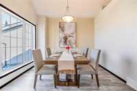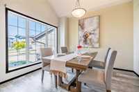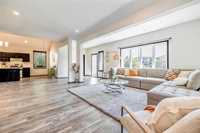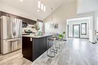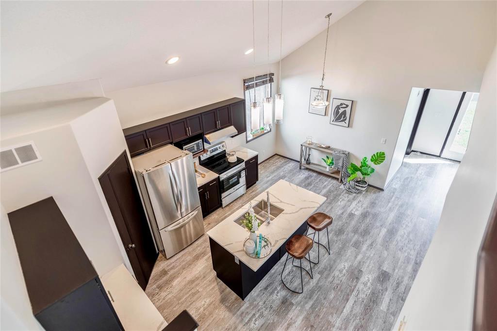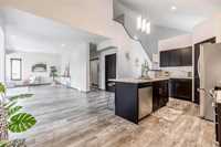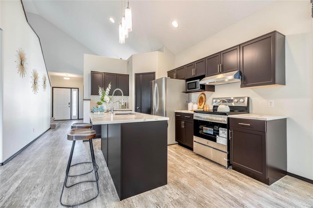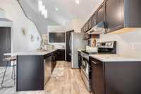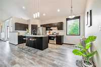 Eat-in kitchen has elegant dark maple cabinetry, SS appliances, large island with quartz counters. Backyard is landscaped, fenced-in