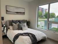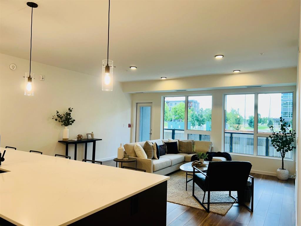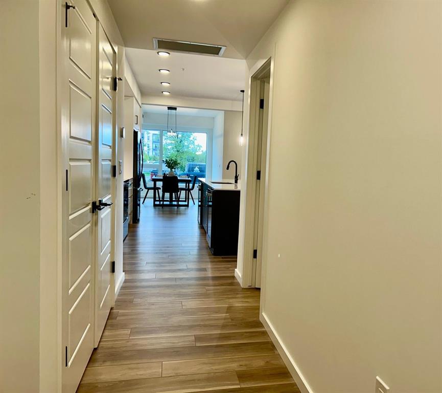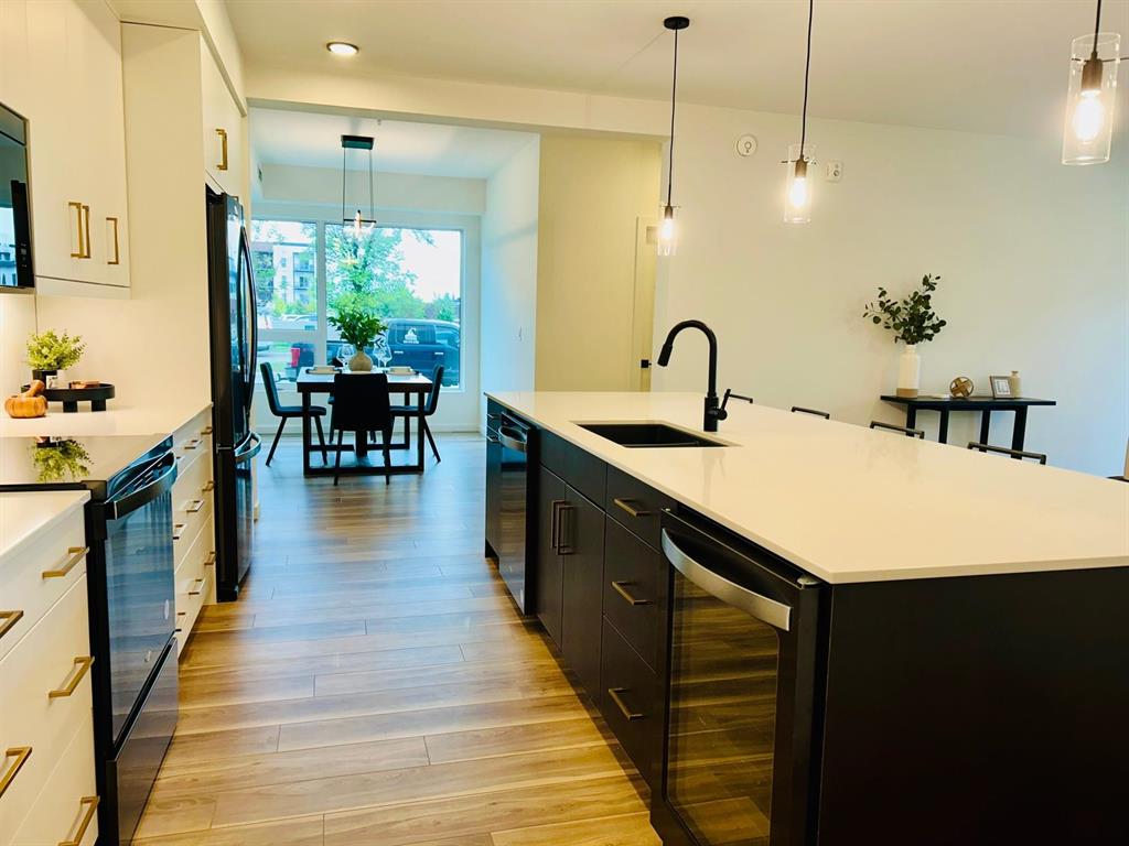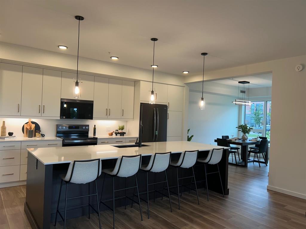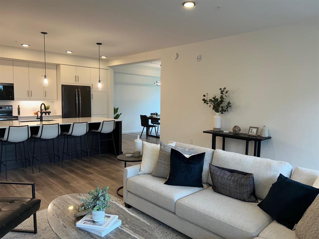 **LAST UNIT!!!** Custom upgrades galore! This wonderful 3 bedroom condo has loads of upgrades in the dreamy kitchen such as Kitchen Craft Soho thermofoil cabinets in white and sambuca, two pantries, extra pot drawers for added storage, a beverage fridge in the island and gold hardware throughout. The "F" floor plan features a nice foyer upon entering the unit and, a dedicated dining space conveniently located off the kitchen. The primary and second bedrooms have plush carpet while the third bedroom and rest of the unit have durable luxury vinyl plank flooring. The primary also has a large walk-in closet and beautiful ensuite with double sinks. Get ready to enjoy those warm summer nights on your private balcony with a glass of wine and a nice BBQ dinner. Feeling social? Head down to the owners lounge to catch a game with your neighbors or play a game of pool! The room can also be rented out for special occasions. A new well equipped gym is also onsite. One underground parking spot is included, two pets are allowed. Sage Village Condominiums is right across the street from all the restaurants, shops, and medical facilities you'll need. Showings by appointment.