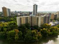 48 hours for acceptance. Charming unit in the heart of Osborne Village! Beautiful Riverfront property. Spacious 2 bedroom unit. Large living room with patio door to balcony that over looks the 2 outdoor pools and a beautiful scenic view of the river. Large hallway closet. Upgrades to Windows, light fixtures, kitchen granite countertop, under cupboard light, and unit has been freshly repainted. Condo fees cover heat, hydro, water. Small pets allowed but must be carried on common areas. Access to a shared laundry room on same floor. Large outdoor picnic areas over looking the river makes this a must see. Quick and easy access to Osborne's vibrant array of shops & restaurants and a short commute to downtown. Parking spots can be rented for a fee and several spots currently available. Please note: Cupboard above fridge in pictures has been taken out. See virtual video!
