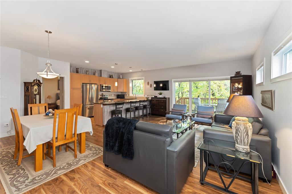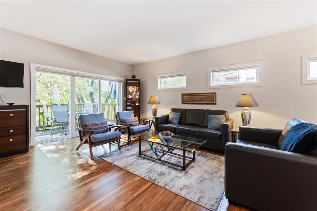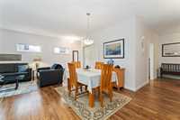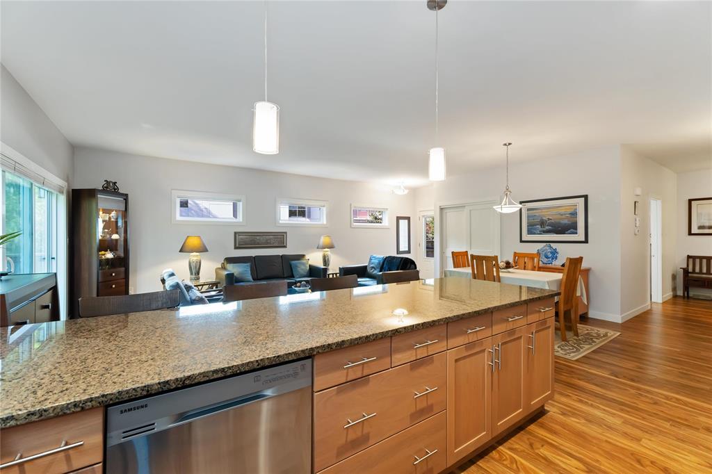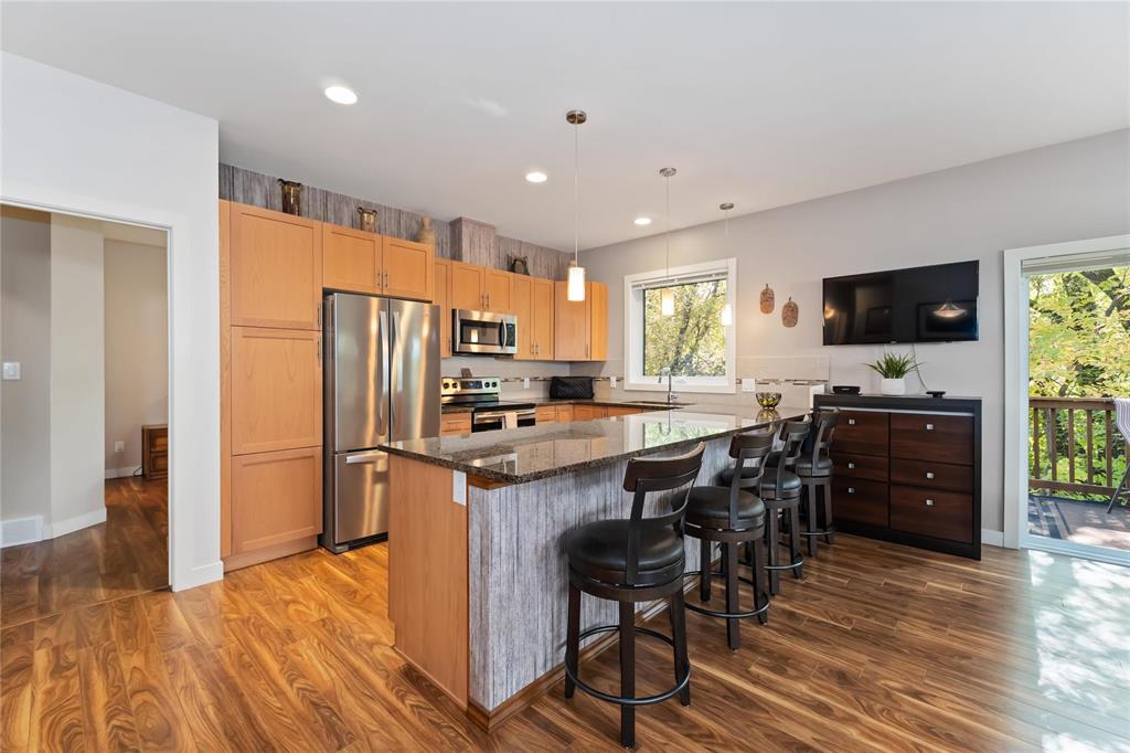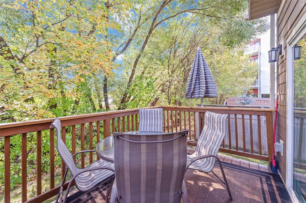 This well maintained, rare end unit location surrounded by trees provides you with a wonderful private experience. Get ready to fall in love with this spacious open concept design that's perfect for entertaining. The kitchen is a chef's delight with granite counters, tons of cooking space, huge island, ample cupboards, and stainless appliances. After enjoying a meal with friends in the adjacent dining area, relax into the grand living room for engaging conversation. Step out the large patio doors onto the deck with your morning coffee sitting under the canopy of trees. Primary bedroom fits a king bed, offers a modern ensuite & walk-in closet. Good-sized 2nd bedroom near main floor full bath & convenient laundry inside. Massive rec room is ideal for hosting the big game, or having fun playing pool (custom 5x9 high end table - negotiable). Plus nicely finished 2-piece bathroom. Tons of storage space in mechanical room, 2nd fridge, HRV system, hi-eff furnace & sump pump. Attached double garage fully insulated & drywalled. This property has been lovingly cared for. Convenient location near shops, transit & steps to Dakota Park. Easy visitor parking next to unit along fence.
