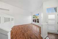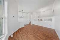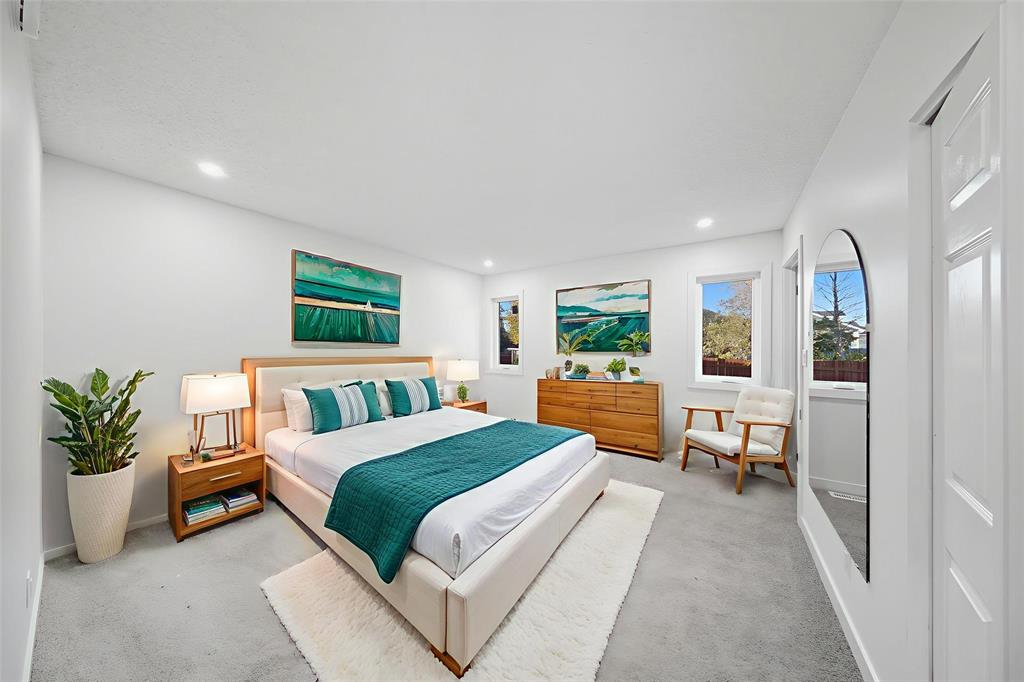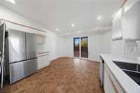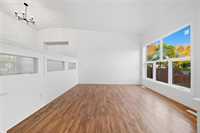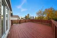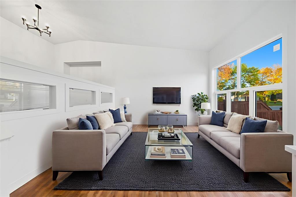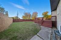 Step inside to a bright and spacious living room with soaring vaulted ceilings and large windows that fill the home with natural light, along with a welcoming dining area. The modern kitchen features large cabinetry, quartz countertops, stainless steel appliances, and a walk-out to the fenced backyard with a deck — perfect for everyday living and entertaining.