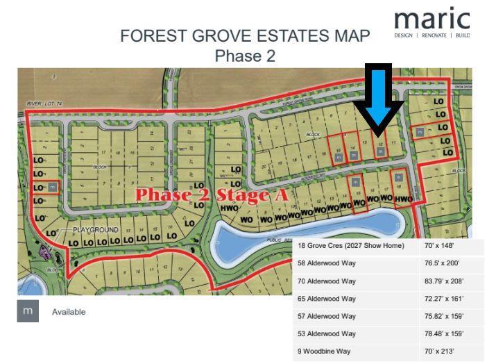 Welcome to 65 Alderwood Way, a custom home opportunity to be built by Maric in a beautiful lot in Phase 2 of Forest Grove Estates. Founded in 1973, Maric Homes has built a distinct reputation among Manitoba home builders. Maric Homes provides unparalleled customer service, unmatched craftsmanship, and design to every project. This huge 72' x 161' lot will feature a 1600sqft bungalow with 3 bedrooms, 2 baths, and a 24'x 22' double attached garage. With high-quality finishing that you've come to expect, this home is no different. Laminate flooring, LVT, & carpet throughout, 9ft ceilings, Hardie Board siding & Stucco exterior, entertainment unit with electric fireplace & more. Kitchen with large island, quartz countertops & an abundance of cabinetry. Spa-like en suite with dual vanity, acrylic walk in shower with glass shower door, and spacious walk-in closet. Contact for more information on selections and other available lots.