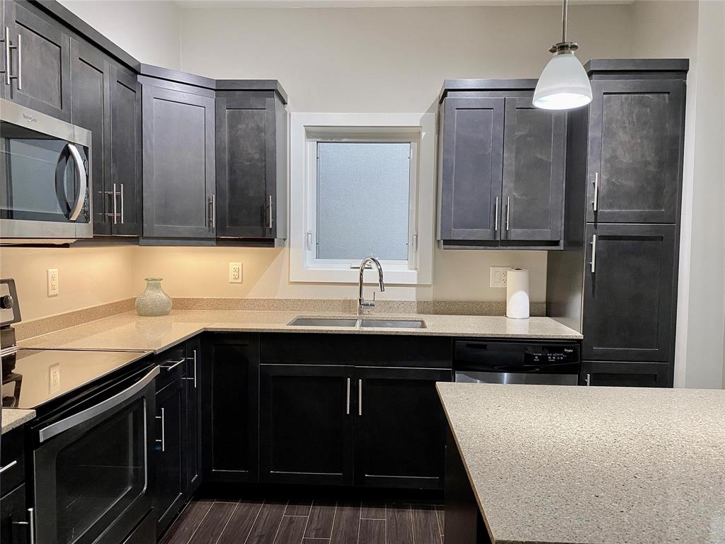 Incredible 2-bedroom, 2-bathroom south-facing corner suite! This unique layout separates the spacious bedrooms from the living area, creating a true "house" feel. The large kitchen boasts real wood cabinets, soft-close doors/drawers, quartz countertops, a generous island with pot drawers, under-cabinet lighting, and stainless steel appliances. The open-concept dining/living area is bathed in natural light, enhanced by extra windows—including two in the living room and one above the sink. The master bedroom features a walk-in closet and a 3-piece ensuite with ample counter space. Additional perks include indoor parking, in-suite laundry with a newer washer/dryer, forced air heating, central AC and laminate floors. Don't miss this rare opportunity!