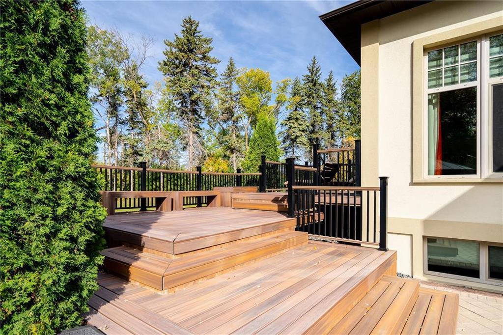Exceptional Riverfront Estate on 1.81 Acres – Historic River Road A rare opportunity to own a European-inspired custom bungalow offering over 6,350 sq. ft. of sophisticated living space on a serene, tree-lined property. Featuring grand living & dining areas with rich stone accents, detailed millwork, soaring 10–12’ ceilings, and a cozy gas fireplace. The gourmet kitchen impresses with dual quartz islands, premium Miele appliances, and a bright 4-season sunroom opening to a tiered deck with hot tub & gazebo. The luxurious primary suite includes a spa-inspired 6-piece ensuite and an impressive walk-in closet. The fully finished lower level offers a state-of-the-art home theatre, sleek bar & recreation space, executive office, 2 additional bedrooms (each with WICs), designer bath, and a full spa retreat with steam shower & sauna. Built to the highest standards with ICF construction (basement to trusses) and geothermal heating for superior comfort and efficiency. Beautifully manicured grounds, triple attached garage, and a quiet private cul-de-sac setting. Just minutes from city amenities, this one-of-a-kind property offers unparalleled elegance, privacy & lifestyle along Winnipeg’s historic River Road.