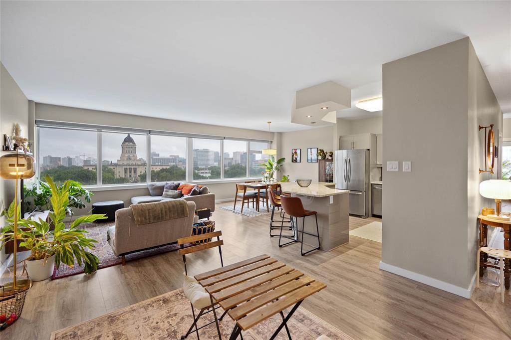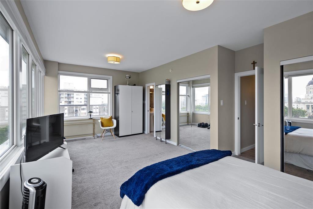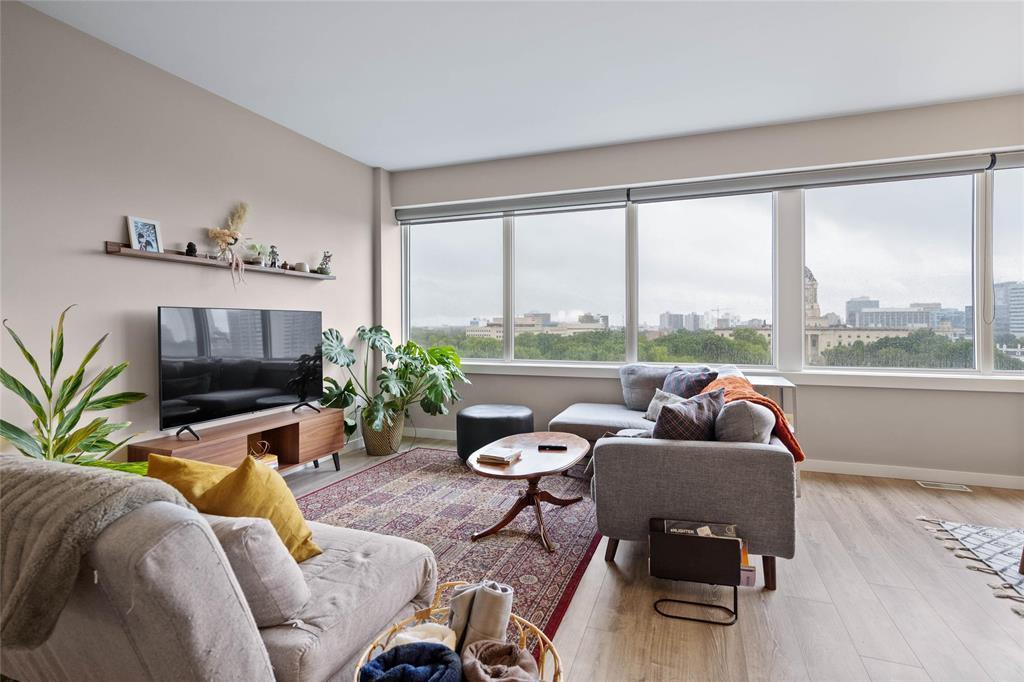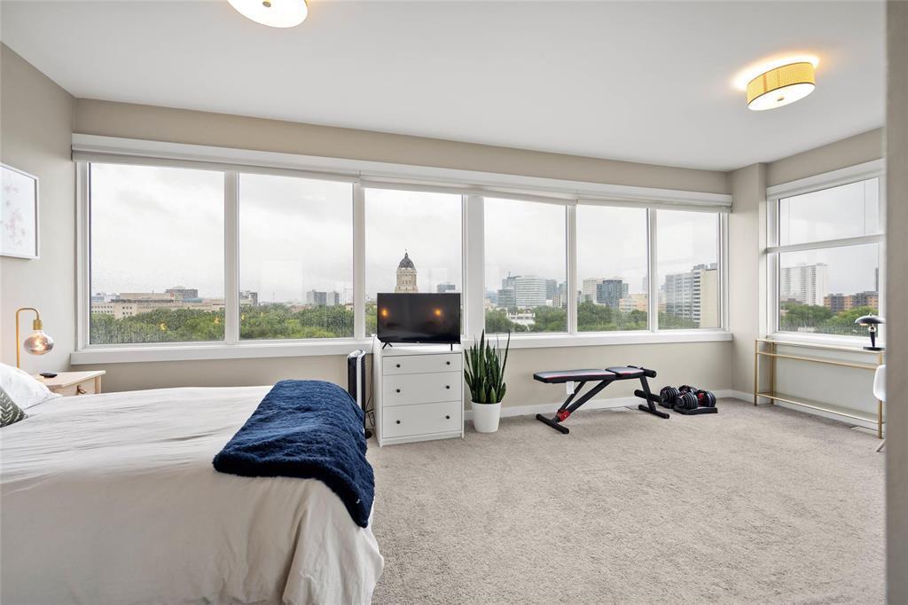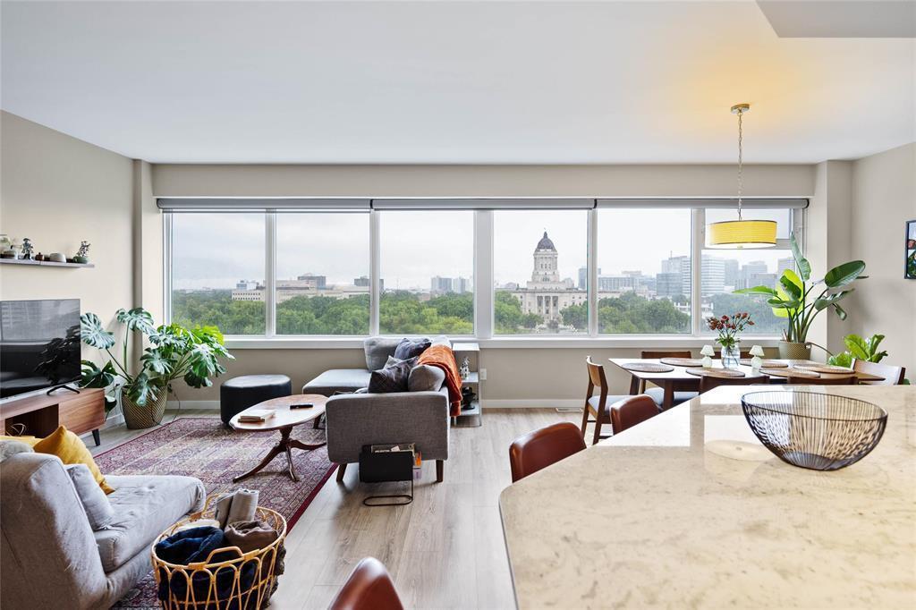 awaits you! Glorious 180 degree views over the Assiniboine River and the Legislative. Wall to wall windows in