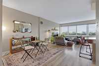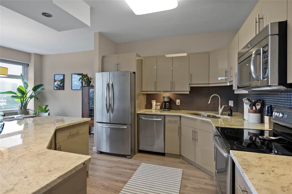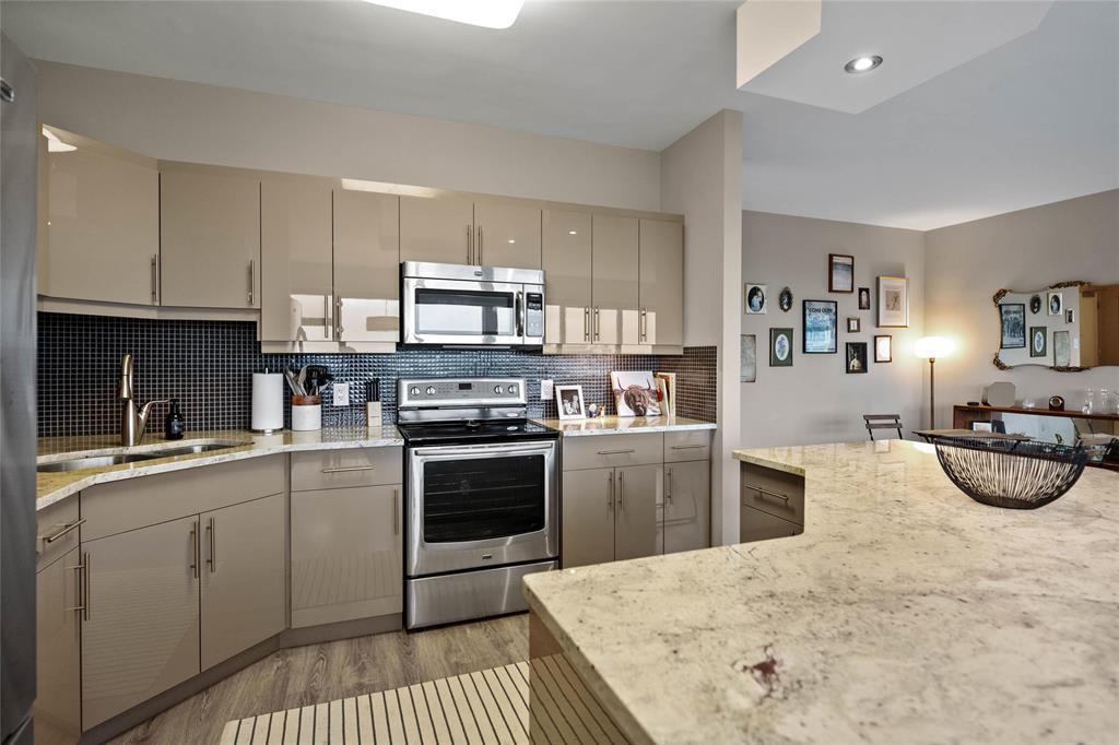 greige high gloss flat front cabinetry and SS appls. 2 sprawling bdrms, primary has a wall of wdws+3pc en-