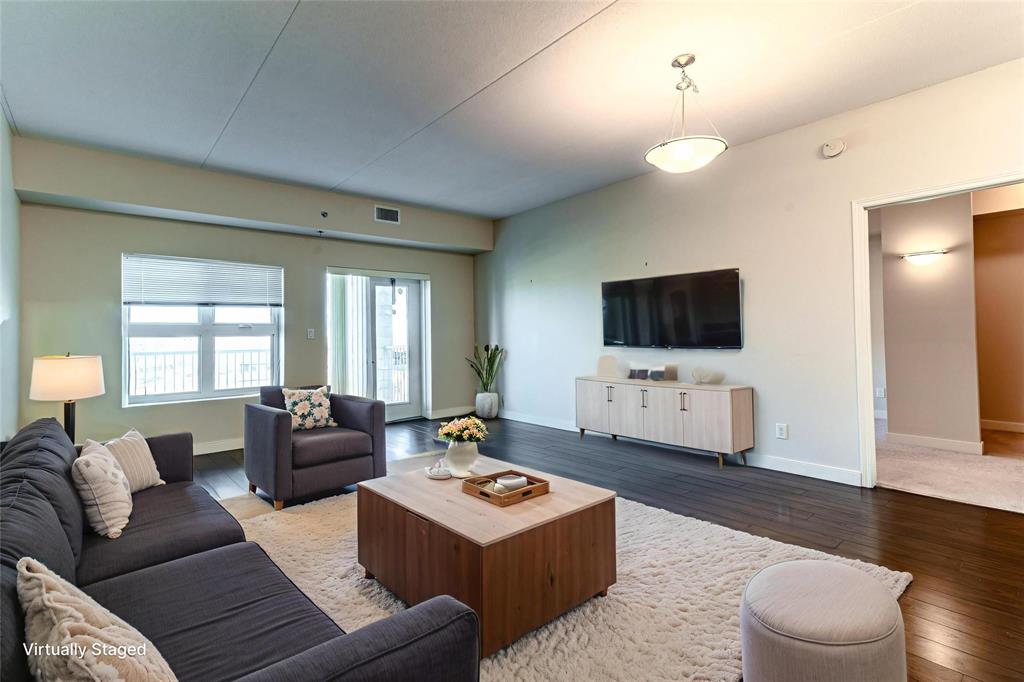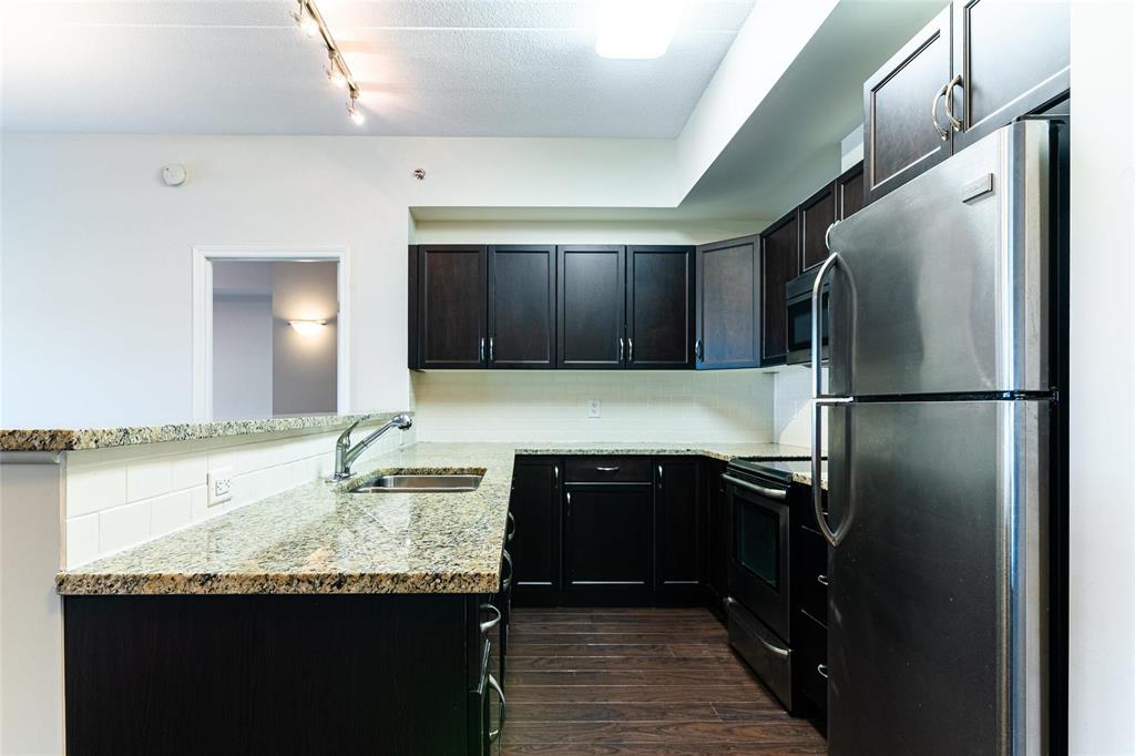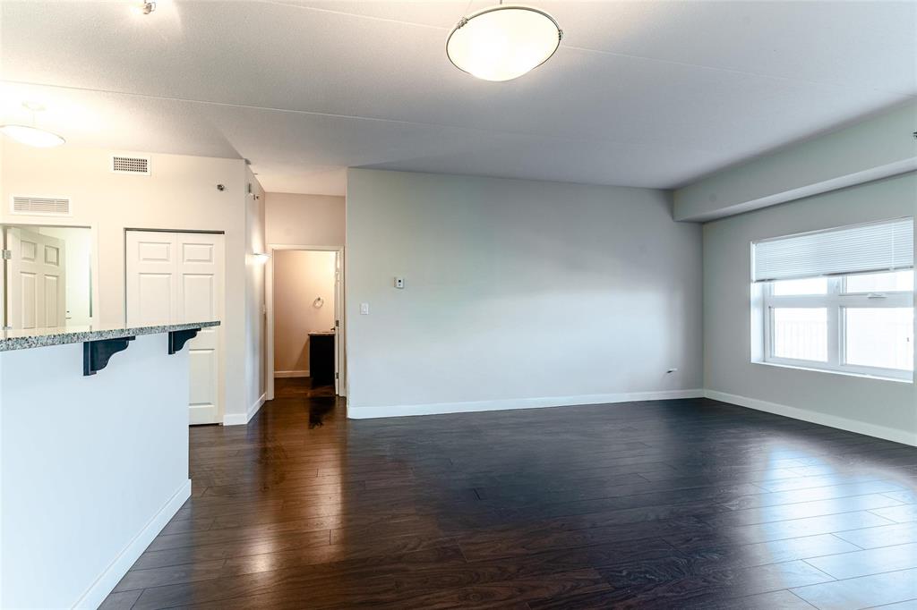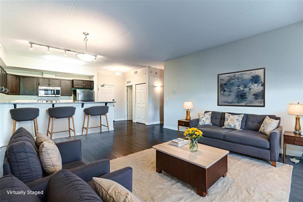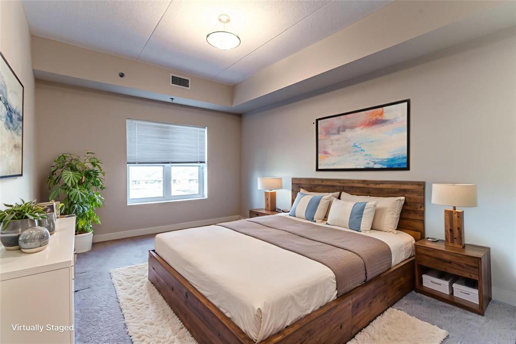 This bright and spacious 1,105 sq. ft. 4th-floor condo offers an excellent use of space with 9’ ceilings, 2 bedrooms, 2 bathrooms, in-suite laundry, and storage. Built with quality and soundproofing in mind, 100 Creek Bend Road features insulated concrete forms, hollow-core floors, and pre-cast concrete balconies supported by concrete columns. The open kitchen featuring tiled backsplash and includes four appliances,a breakfast bar, while the foyer offers huge coat closet. The laundry/storage room is equipped with front-load washer and dryer and space for additional storage. Enjoy the large balcony—perfect for a full patio set and BBQ facing NW.This pet-friendly, smoke-free building offers two parking spots (one underground and one outdoor), two elevators, secure entry, and convenient mail delivery. Located near the Seine River Pathway and close to amenities. Quick possession available!