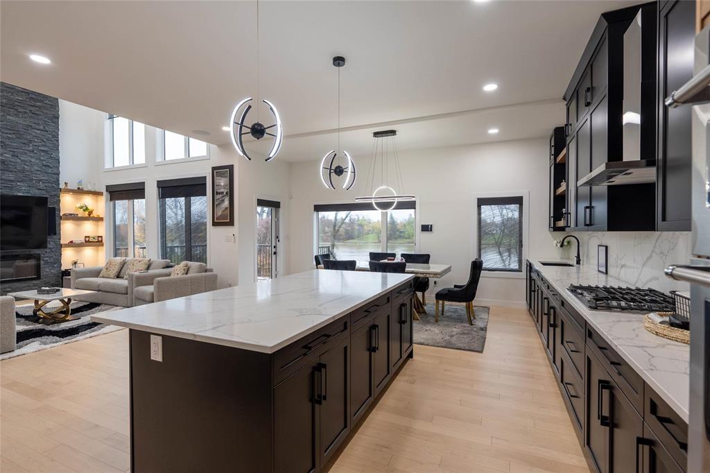 Discover this truly exceptional riverfront home where luxury, comfort, and modern design meet. From the moment you step inside, you’ll be captivated by the bright, airy layout featuring soaring 10’ ceilings and an inviting foyer. The sleek designer kitchen boasts an impressive 8’ island and effortlessly connects to the spacious dining and great room, perfect for gatherings and everyday living. Step out onto the raised deck and take in the peaceful river views that surround you. The main level is completed with a butler's pantry, bedroom, a 4-piece bath, plus a generous mudroom. Upstairs, you'll be greeted by a massive 24’ loft ideal for family time or relaxation. The primary suite features its own private balcony and 5-piece ensuite bath, being the perfect place to unwind. You’ll find two more bedrooms, each with their own walk-in closets and 4-piece ensuites. Downstairs, a spacious rec room with two bedrooms and a full bathroom offers plenty of room for family and guests, while the oversized triple attached garage provides exceptional convenience and storage. Enjoy this home designed to take full advantage of the serene riverfront setting.