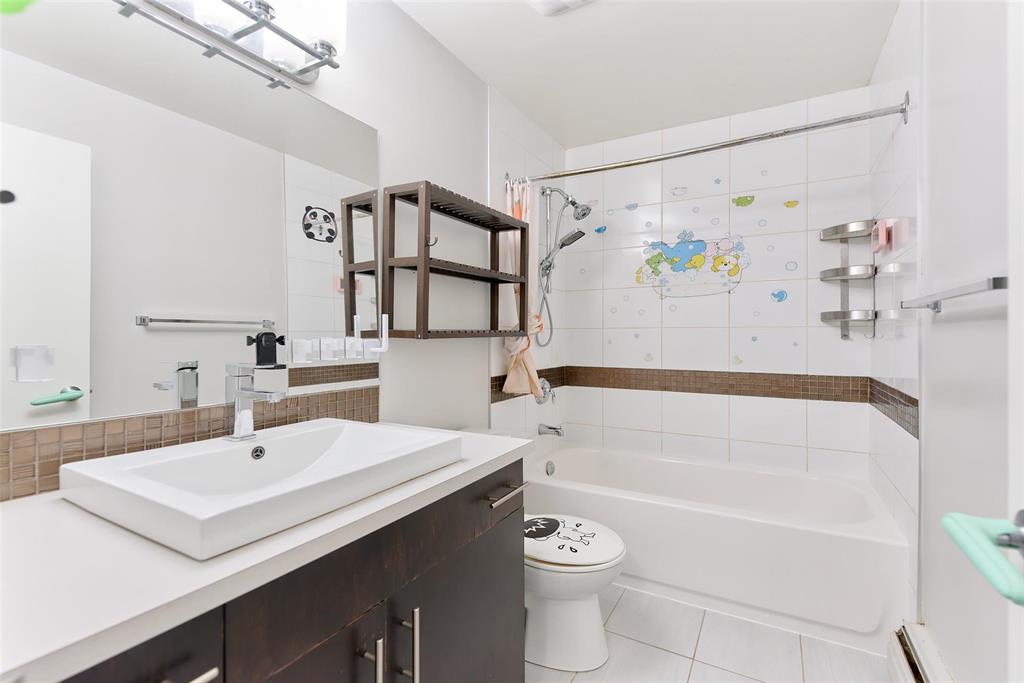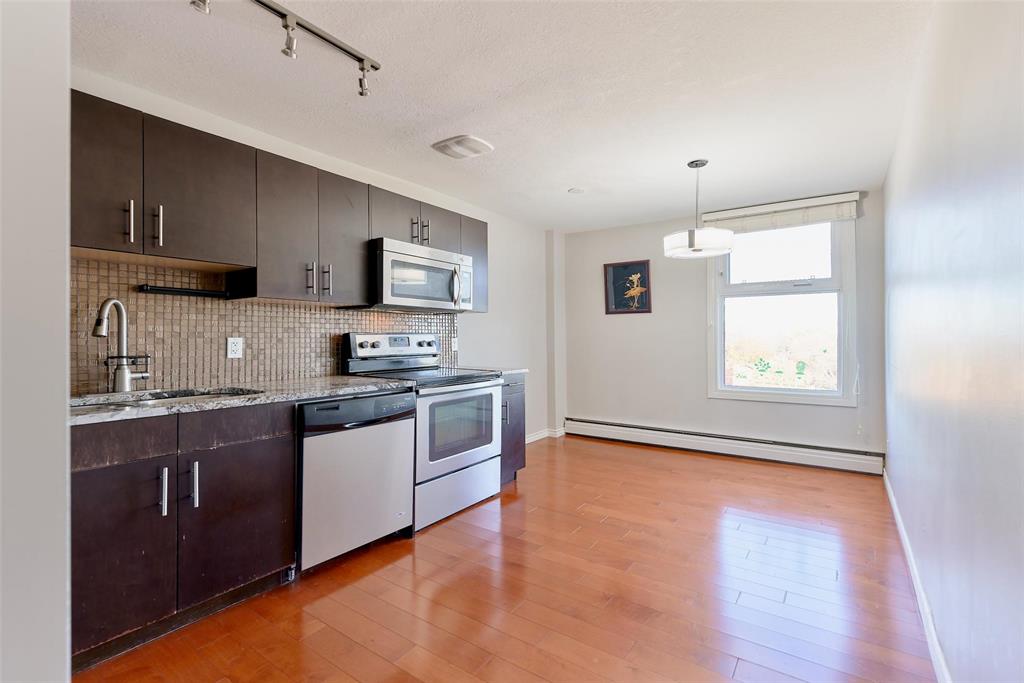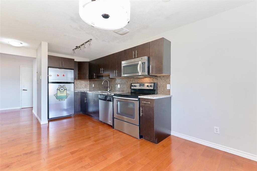 The home showcases engineered hardwood flooring throughout, maple kitchen cabinets with granite countertops, tiled backsplash, and stainless steel appliances. The living room opens to a balcony filled with natural light, perfect for relaxing. Freshly painted walls add a modern touch. Enjoy the convenience of in-suite laundry, with an additional shared option available in the building. This well-maintained and professionally managed concrete structure saw major updates in 2022, including high-efficiency boilers and a new elevator system.