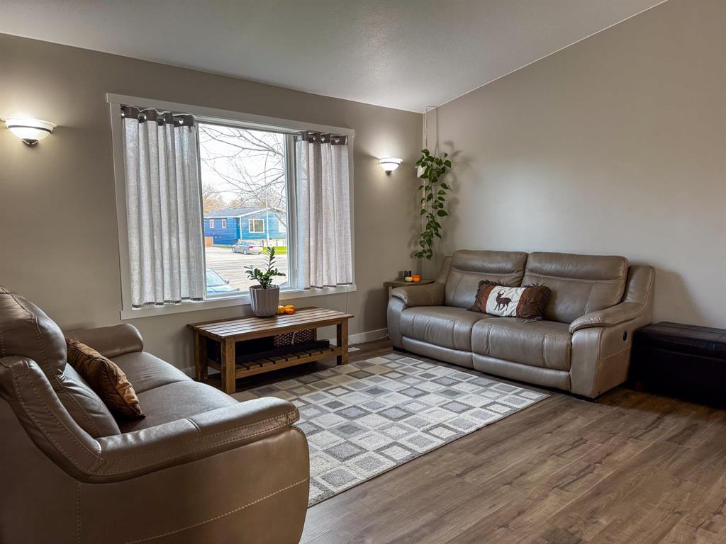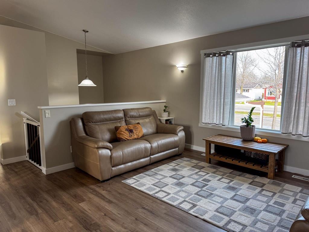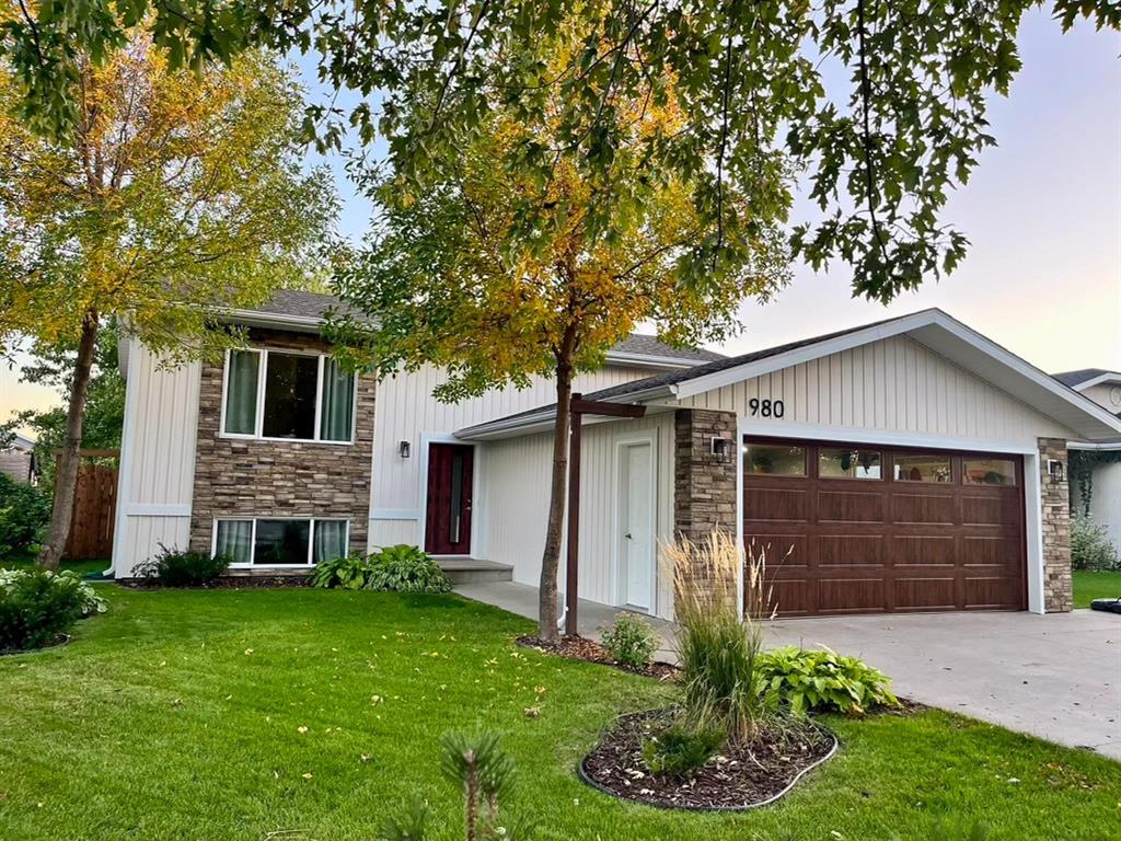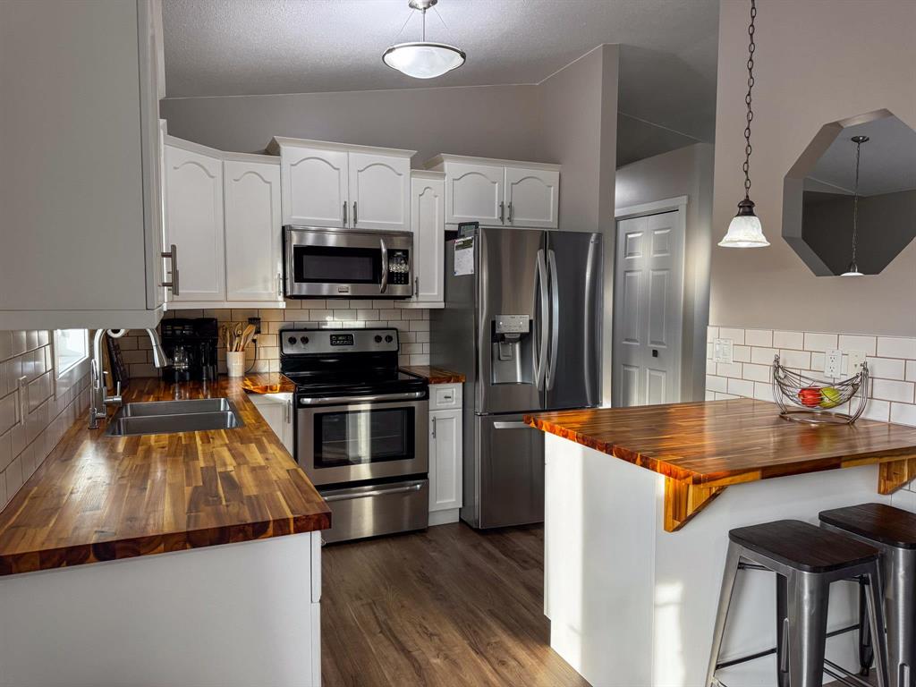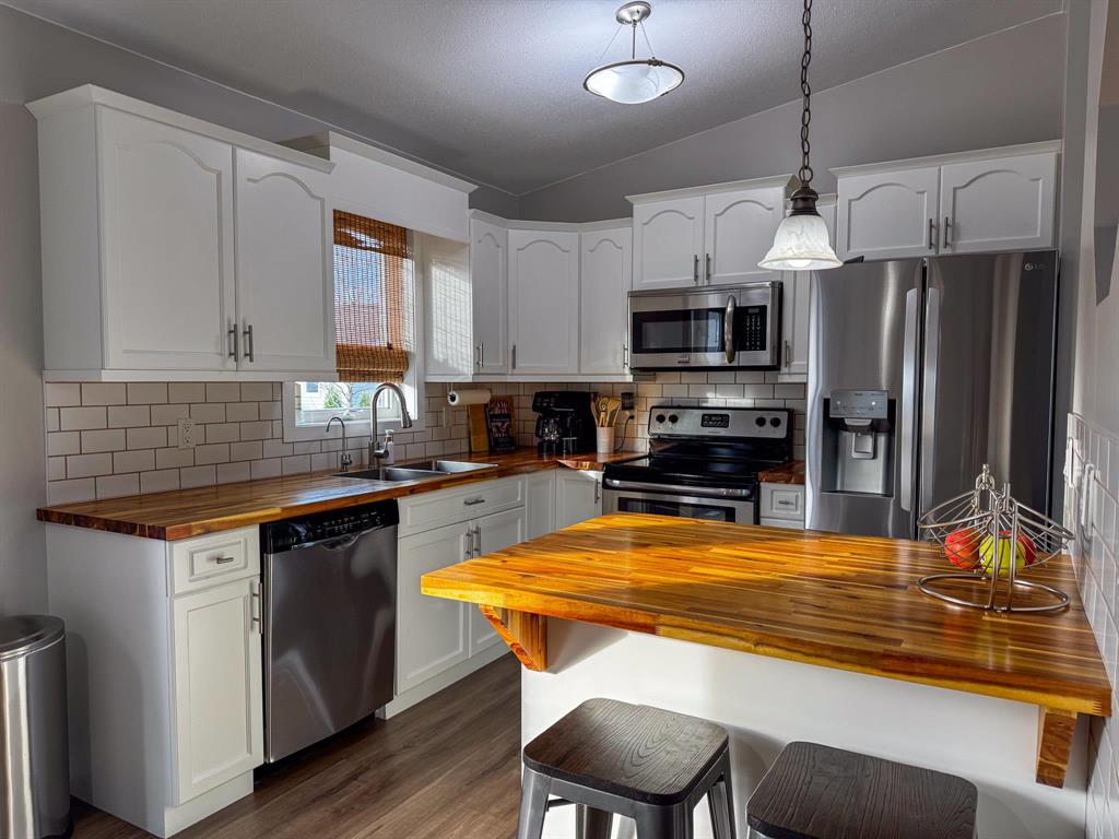 The updated exterior, featuring new siding, brick accents, and garage doors, gives this home great curb appeal. The large 2-tiered back deck, perfect for entertaining, and the fully fenced backyard along with nearby schools make this home ideal for a young family. Inside, the main floor features vaulted ceilings in the open living area with a painted white kitchen with subway tiled backsplash, wood countertops, & peninsula situated next to the dining room, which leads with garden doors to the back deck. The main floor features a primary bedroom, 2nd bedroom, and updated bathroom with tub & tiled wall. The fully finished basement includes a well-sized rec room with play area and big windows, 2 additional bedrooms, 3-pc bath, and laundry/mechanical room. Additional highlights include: home being located on a service road, insulated & drywalled 20’ x 22’ garage with 220 plug, and concrete driveway. Fridge, stove, dishwasher, washer & dryer are included. With no offer deadline, schedule your private showing today! Showings start Monday, Nov 3rd.
