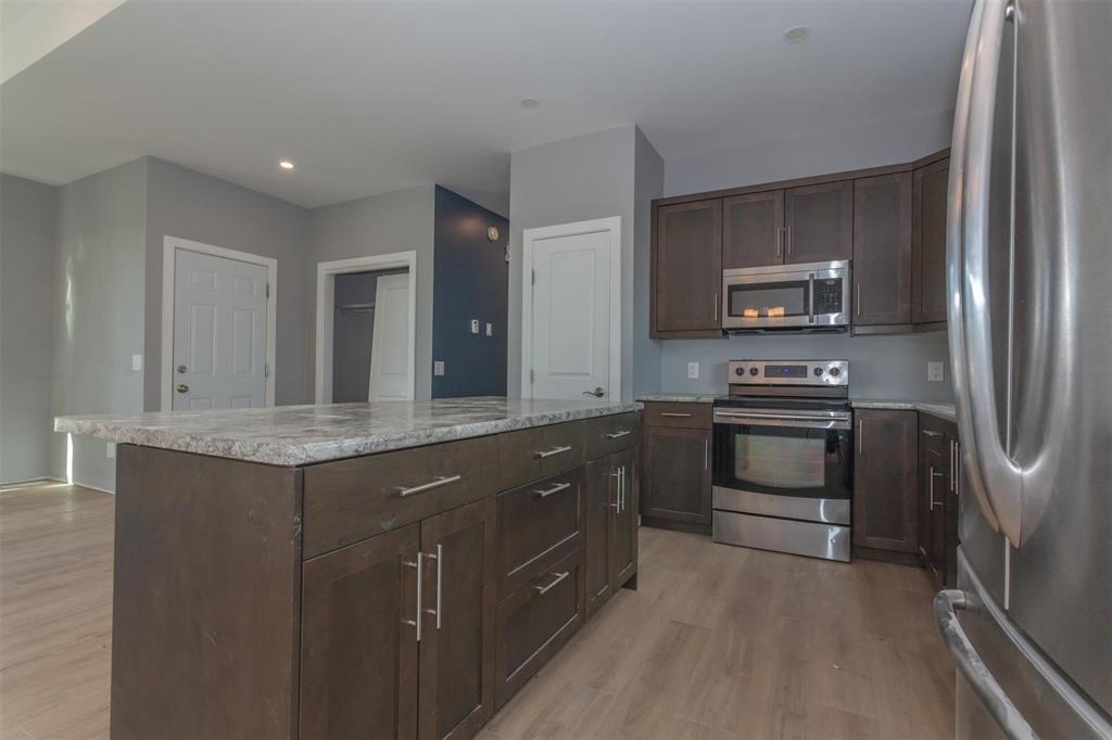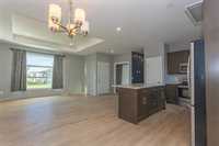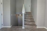 The main entrance is bright and inviting, showcasing tall ceilings and a split staircase leading to each level. The kitchen on the main floor includes a functional island and dark espresso cabinetry that adds warmth and modern style.