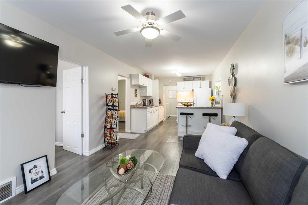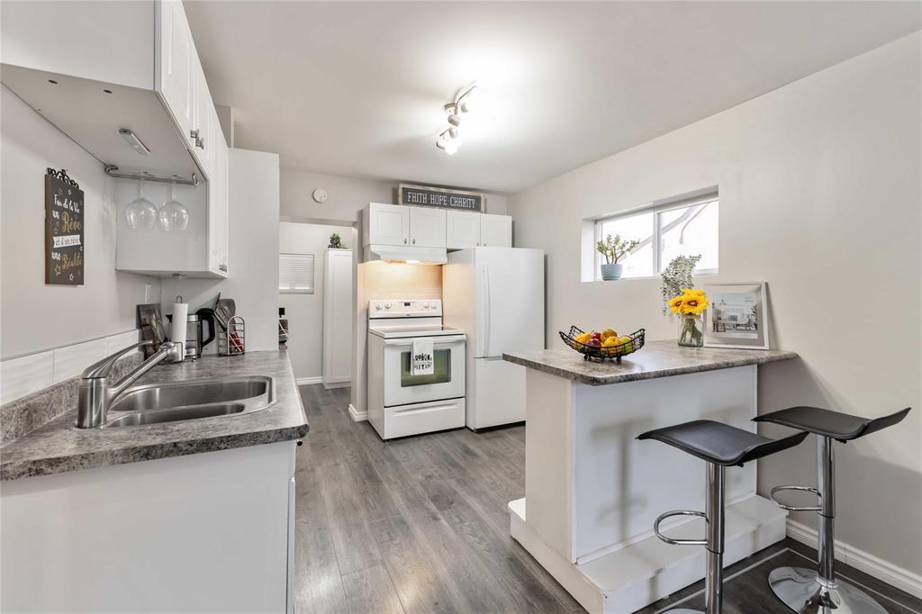 Offers presented evening received. Move in ready, fully renovated 2 bedroom, 1 bathroom home. Perfect for first time buyers, retired, or investors. Tons of natural light. Open concept, spacious kitchen with lots of newer cabinets & counter tops. Convenient island/kitchen table with additional cabinets. Newer appliances. Fridge 2024. Recently renovated bathroom (2023) Newer windows. 2 Bedrooms with wardrobes included. Mudroom with laundry and additional wardrobe. Dry, solid partial basement with extra storage space. 100amp panel will be installed mid Nov, permit will be closed prior to possession. NO knob & tube. New shingles (2024) Brick patio with beautiful wooden gazebo that has natural warm finish creates a perfect sitting area for you, your family & friend.Front sidewalk (2024). 3 car parking pad. Close to schools, parks, playground, shopping center. Own your home and pay a mortgage that's even lower than rent.