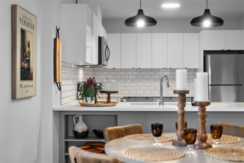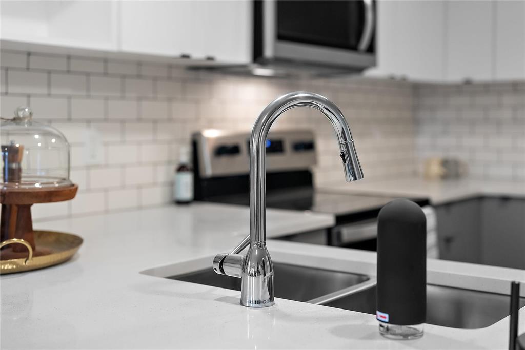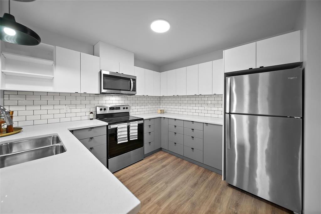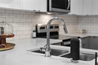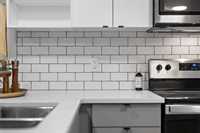 • Modern Kitchen with high-end appliances, quartz counters and tiled backsplashes