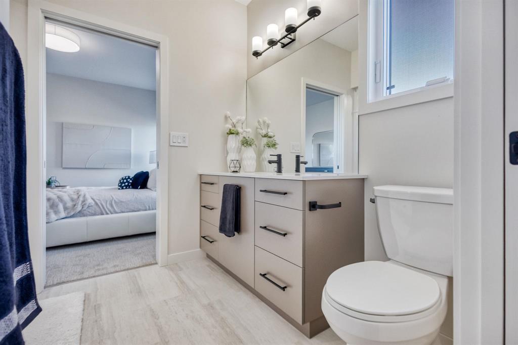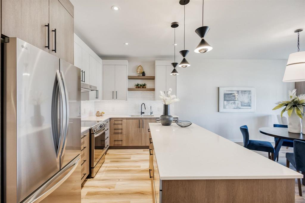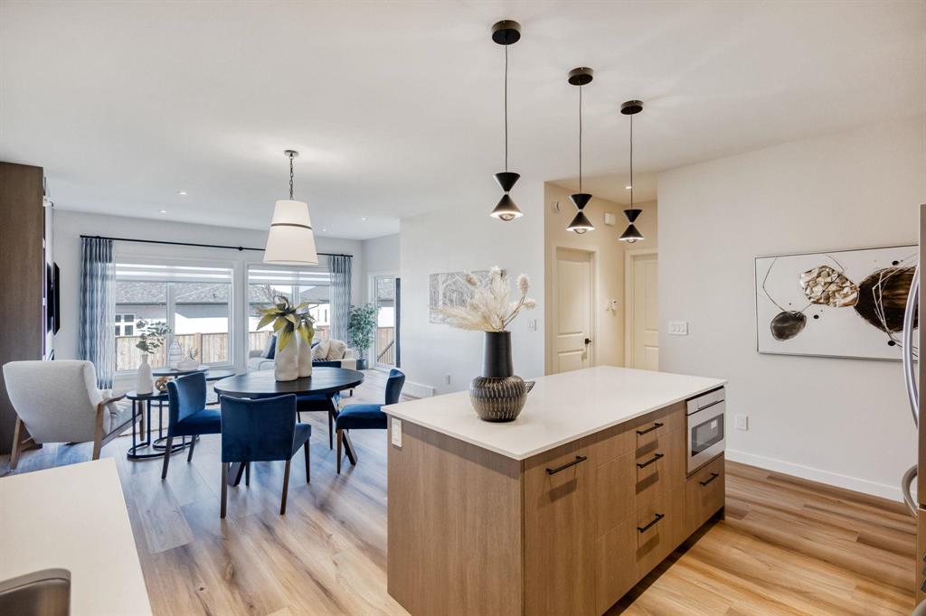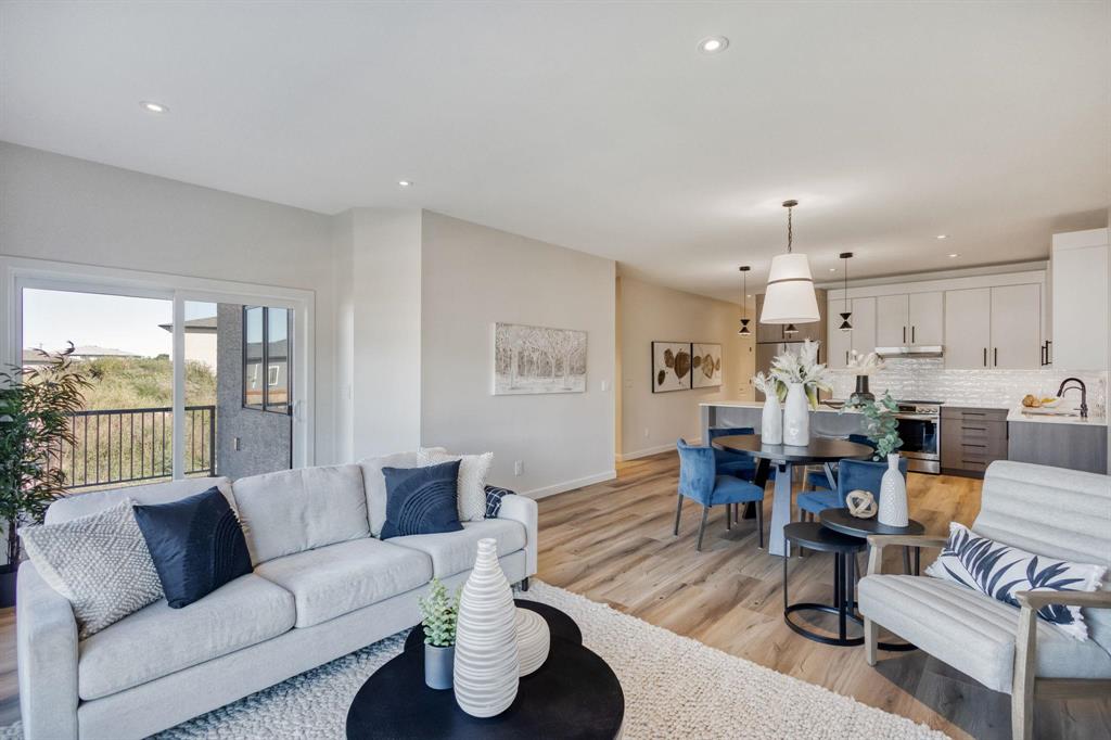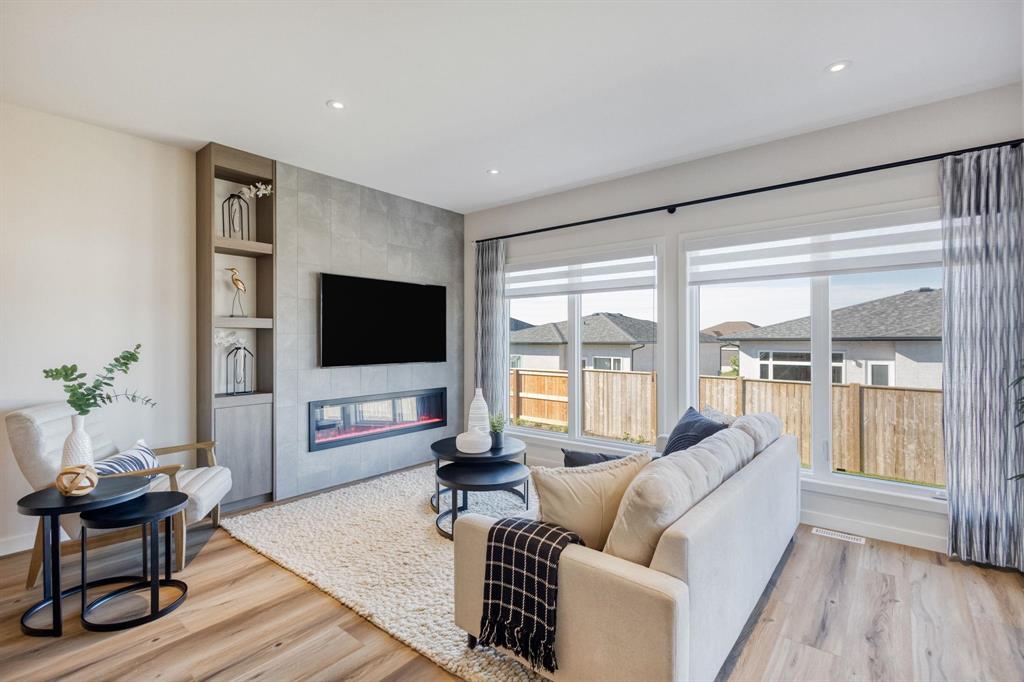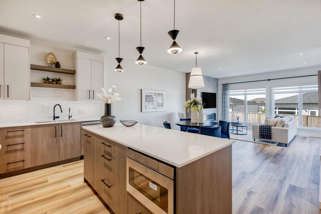Built by Warkentin Custom Homes,this 2bdrm 2bthrm 1297sqft BNG w/ full bsmt & dbl att garage is sure to impress!Step inside to LVP seamlessly through the main living area.Eat in kitchen offers 2tone upper&lower soft close cabinets w/ plenty of pot drawers,quartz counters,subway tile b/S,SS appliances included,island w/built in microwave&seating for 3.Formal dining open to the living rm featuring tile facing electric FP w/ built-in shelving,West facing wndws&patio dr to your covered deck.Primary offers WIC,3pc ensuite w/ 1pc acrylic shower w/ glass drs & large vanity.2nd spacious bdrm,4pc bthrm,convenient main flr laundry w/ built-in cabinetry finish off the main flr. Addtl upgrades & features:steel beam construction,plywood subfloor w/ I joist,Spray foam flr joist cavities,Lennox furnace w/ central air.2 flr
