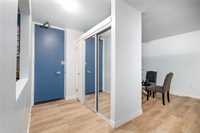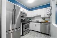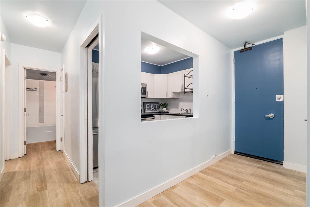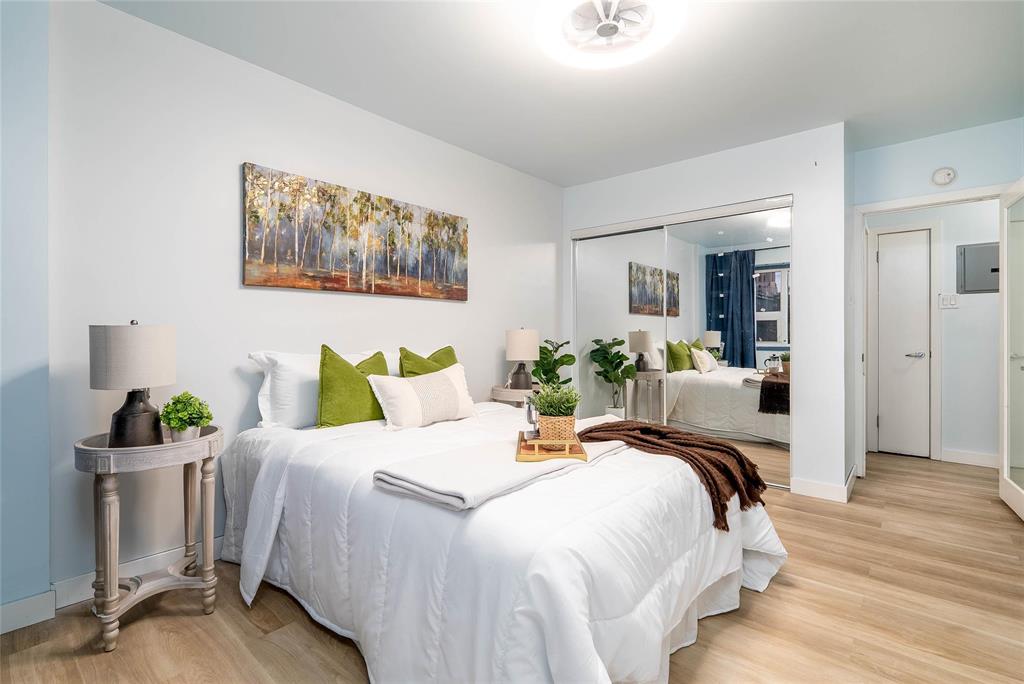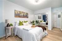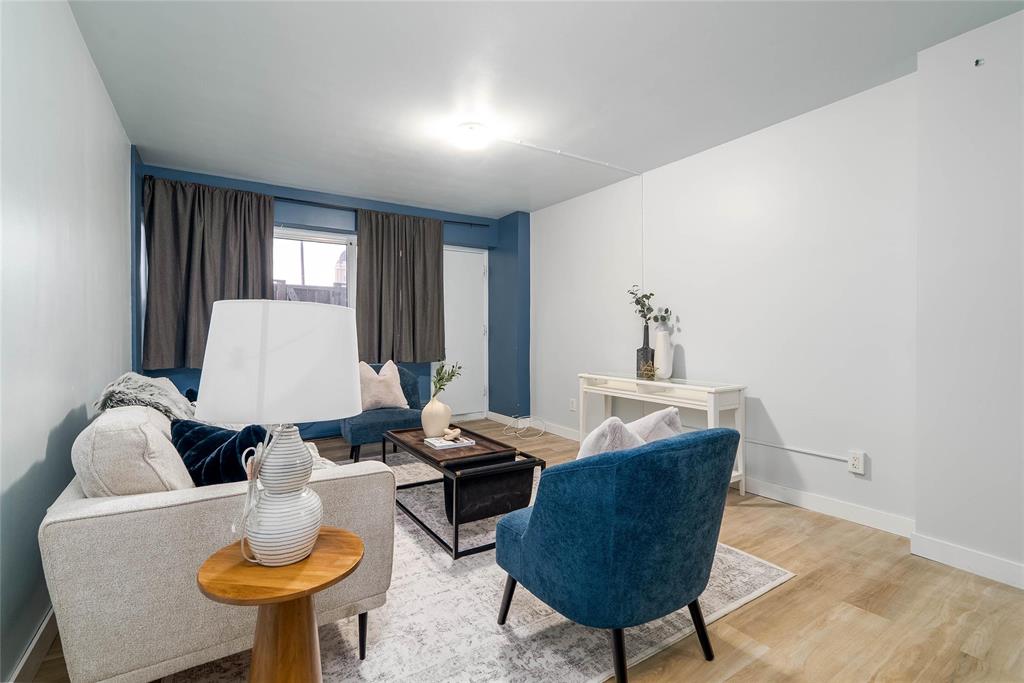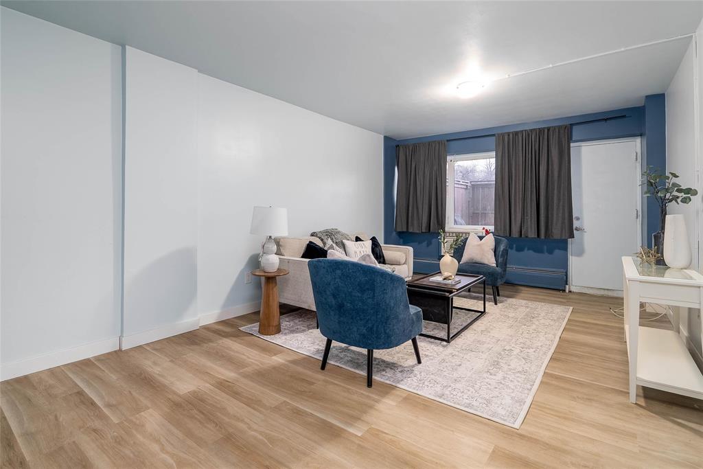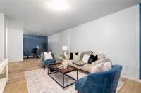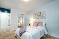 The functional layout features a bright living area, an efficient kitchen with ample storage, and two well-sized bedrooms. Large windows throughout allow for plenty of natural light, creating a warm and inviting atmosphere. The common laundry room is conveniently located across the hall.