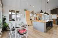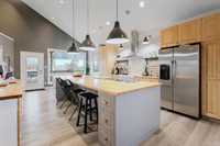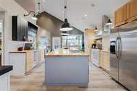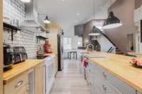 At the heart of the home lies a gorgeous kitchen, featuring maple cabinetry, oversized white subway tile, & a nearly 12-foot butcher block island with overhead lighting, that seems made for Sunday breakfasts, holiday dinners, & late-night laughter. A built-in coffee bar, appliances included, & plenty of windows make this kitchen as functional as it is beautiful.