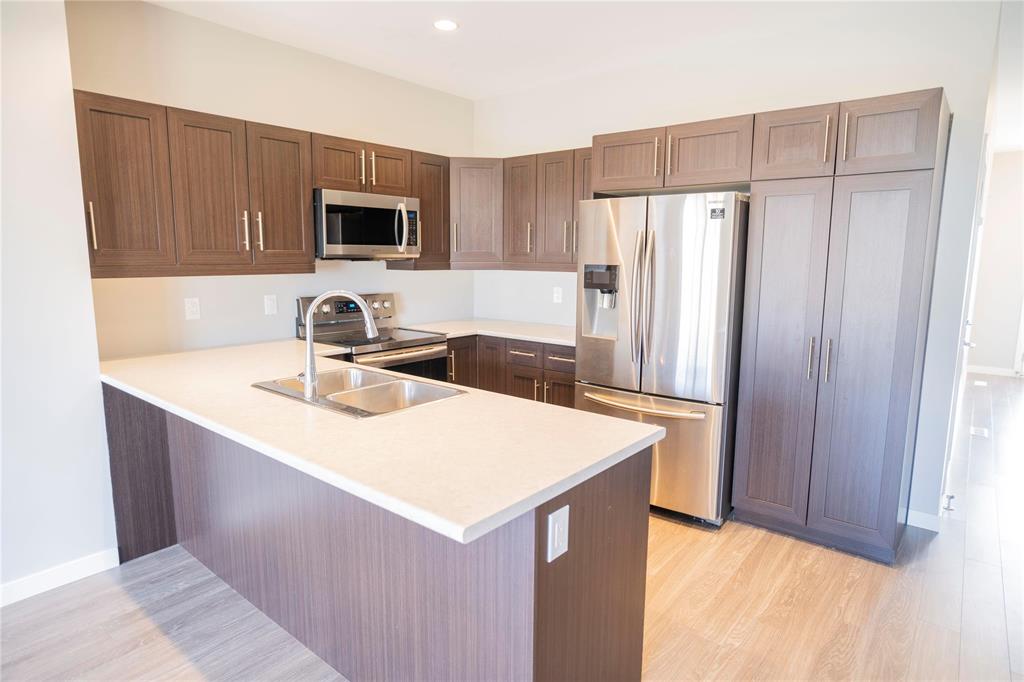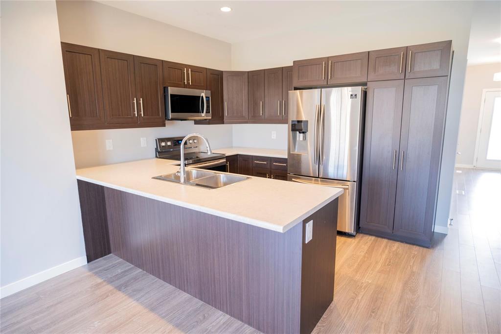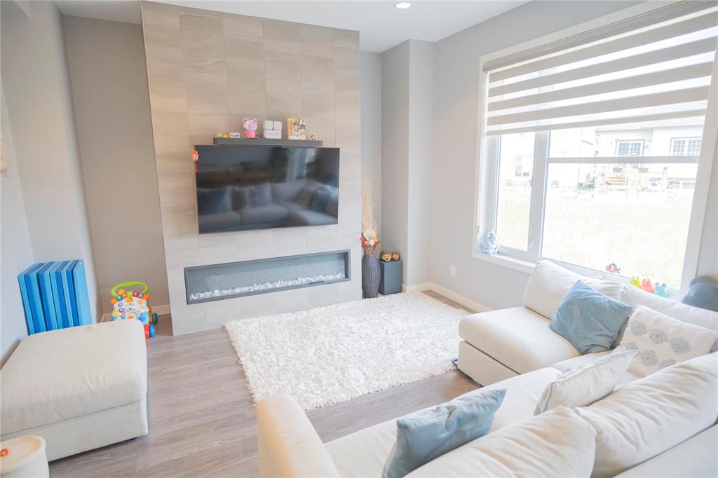 SS now. Offer anytime. Welcome to 131 Arbourwood, a stylish and well-kept side-attached home located in a quiet, family-friendly neighbourhood in Winnipeg. This inviting residence offers an open-concept main floor featuring a modern kitchen with stainless steel appliances, double sink, sleek countertops, and elegant dark cabinetry. The kitchen flows seamlessly into the dining and living areas, perfect for entertaining or relaxing with family. The spacious living room is highlighted by a tiled feature wall with a built-in electric fireplace and