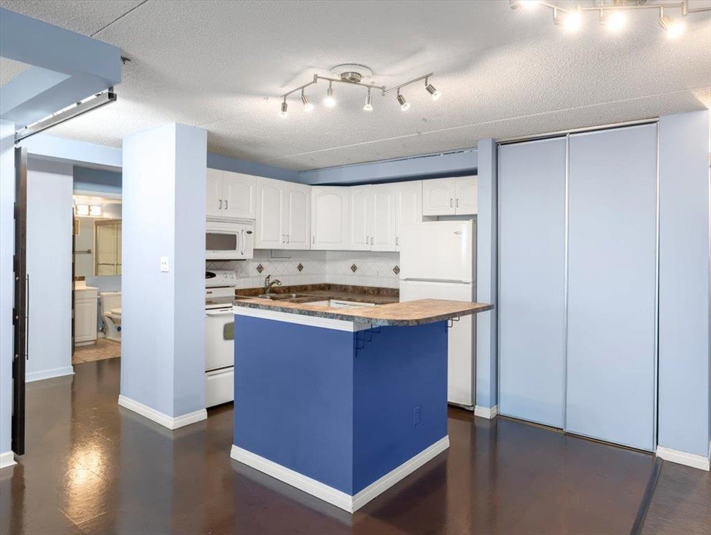 SS Now, Offers as received. Welcome to your unit in the sky — a rare top-floor, corner suite offering spectacular, unobstructed views in a quiet and solid concrete building. The open-concept living and dining area is filled with natural light and flows seamlessly into the bright, white kitchen, creating a comfortable and inviting space to relax or entertain. The unit features one spacious bedroom, a well-appointed 4-piece bathroom, and the convenience of in-suite laundry. Underground parking is included, adding year-round comfort and security. Situated in a fantastic location, this home is just steps from a wide range of amenities including shopping, dining, transit, and parks. Whether you’re a first-time buyer, downsizer, or investor, this move-in-ready unit offers exceptional value in an unbeatable setting.