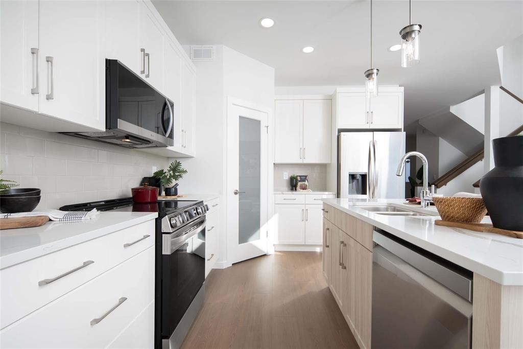 Main floor features builder grade laminate flooring, a versatile den perfect for an office or extra living space, spacious Great Room with an elegant Electric Fireplace, all Quartz Kitchen countertops, functional island with 3 Pendant Lights and plenty of cupboards.