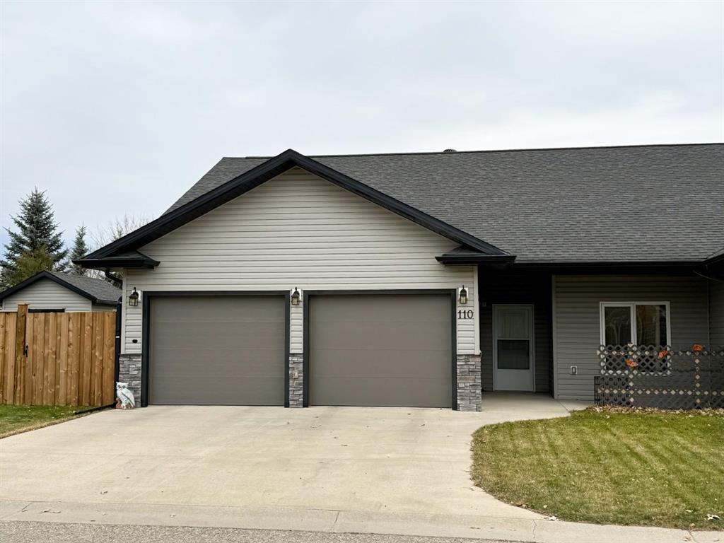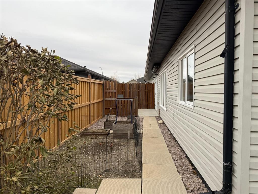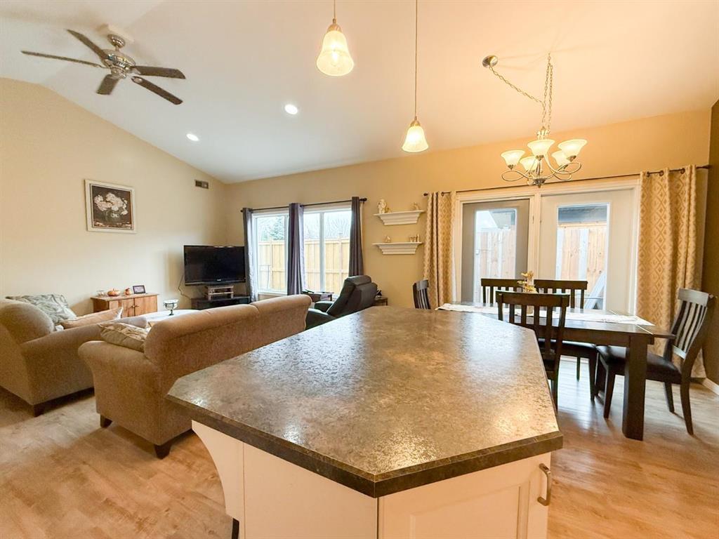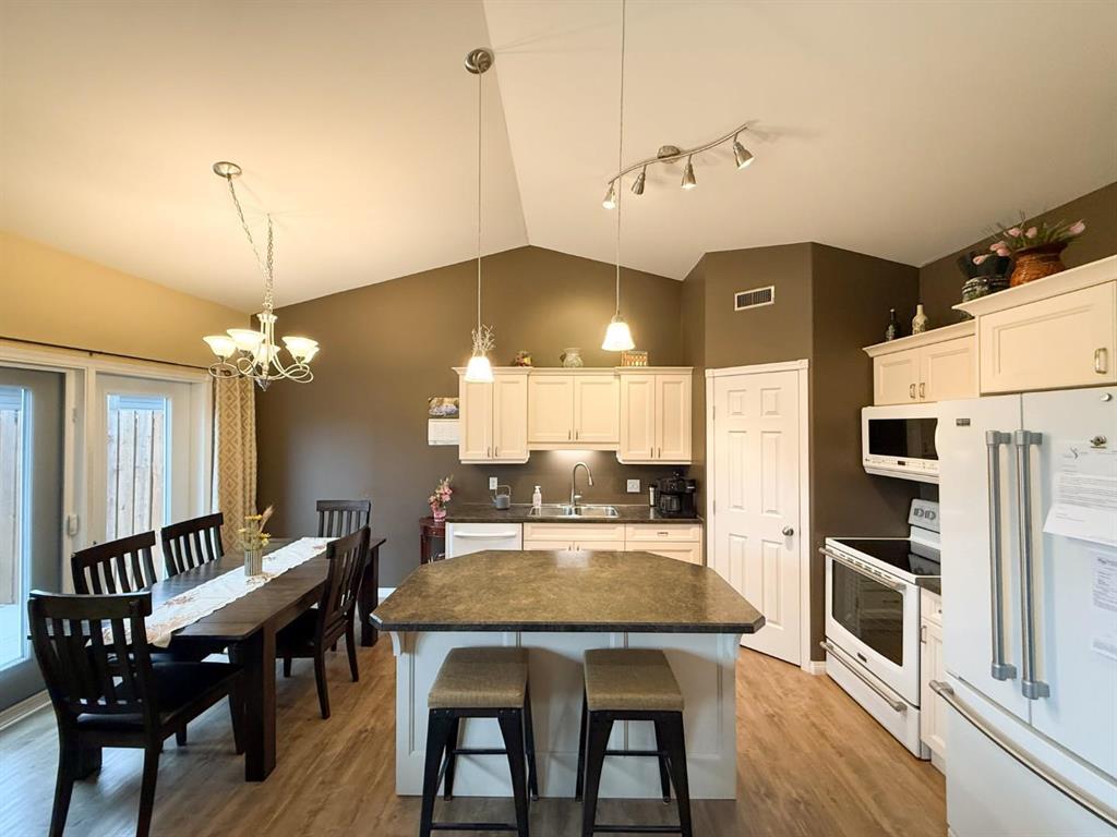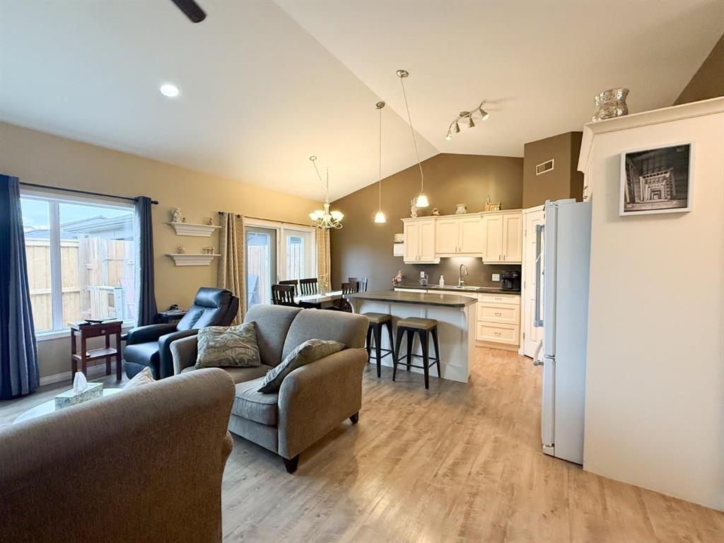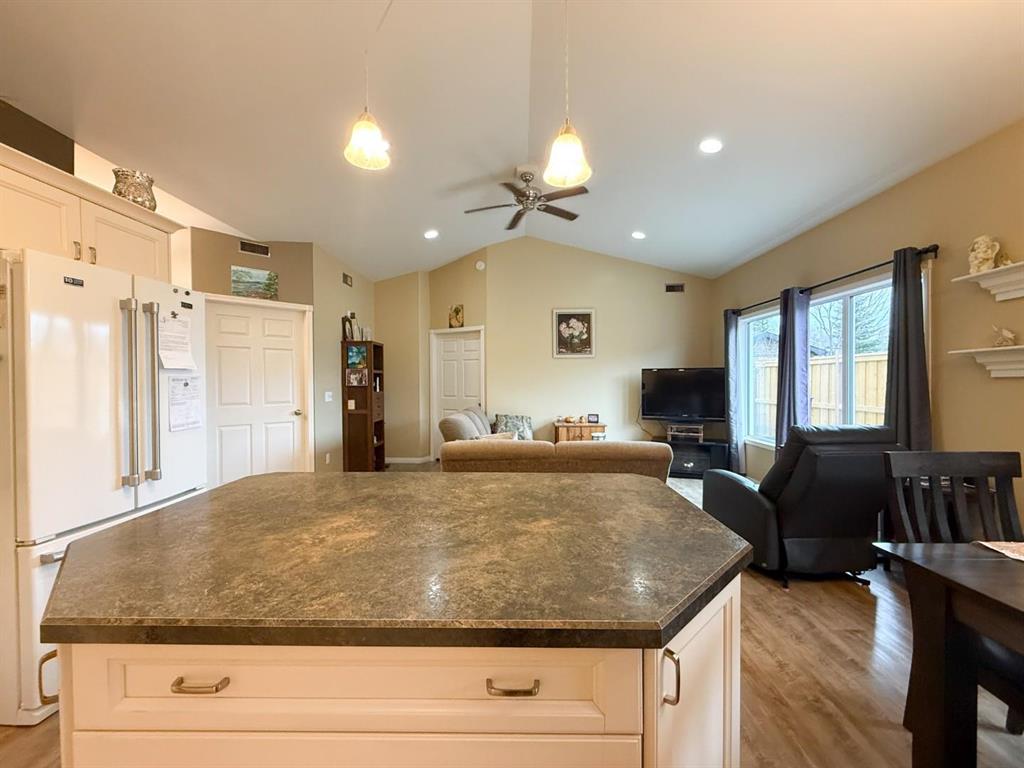 Check out this beautiful one-level home with a double attached garage, floor heat throughout, no steps, and wide doors to allow wheelchair access! The fully fenced yard offers privacy, gardening space, a small shed with electricity for tinkering, and a concrete patio with a retractable awning. The home features an L-shaped kitchen with a corner pantry and island overlooking the dining and living area, all with vaulted ceilings. The primary bedroom has a 3-pc ensuite, which leads to a roomy walk-in closet. Other features include a 2nd bedroom to the front, a 4-pc bath, and a laundry/mudroom leading to the garage. Enjoy the natural light through the large window on the south, with access to the back yard patio through the garden doors off the dining area. Updates include a new concrete patio (2018), floor heat thermostat & pump (2020), toilets (2022), retractable patio awning (2022), washer (2022), storm/screen doors (2023), lifetime stainless steel water heater (2024), fence (2024), kitchen & bathroom faucets (2025). Take advantage of this affordable property today!