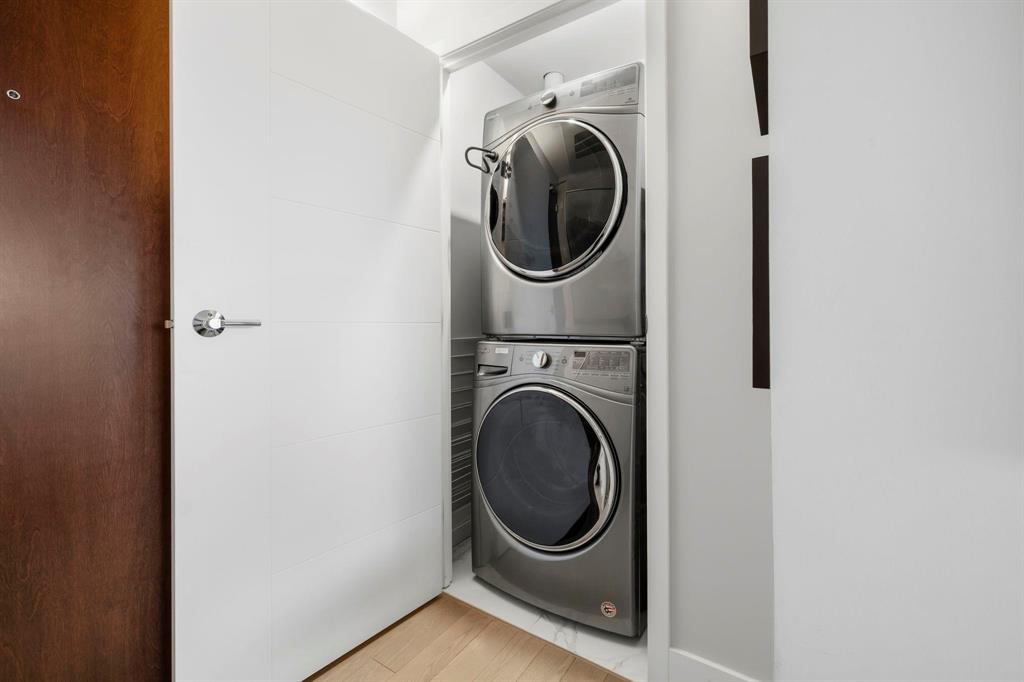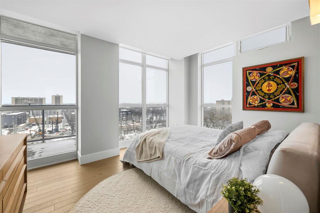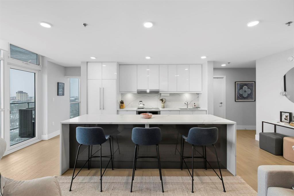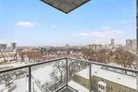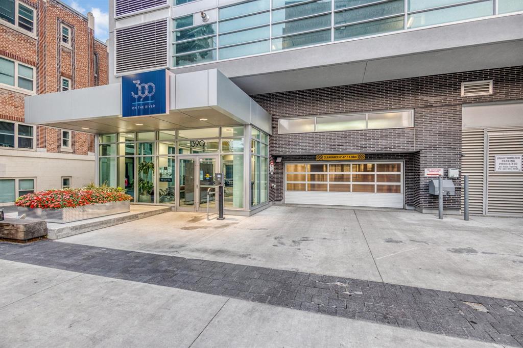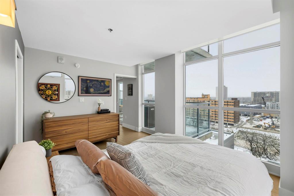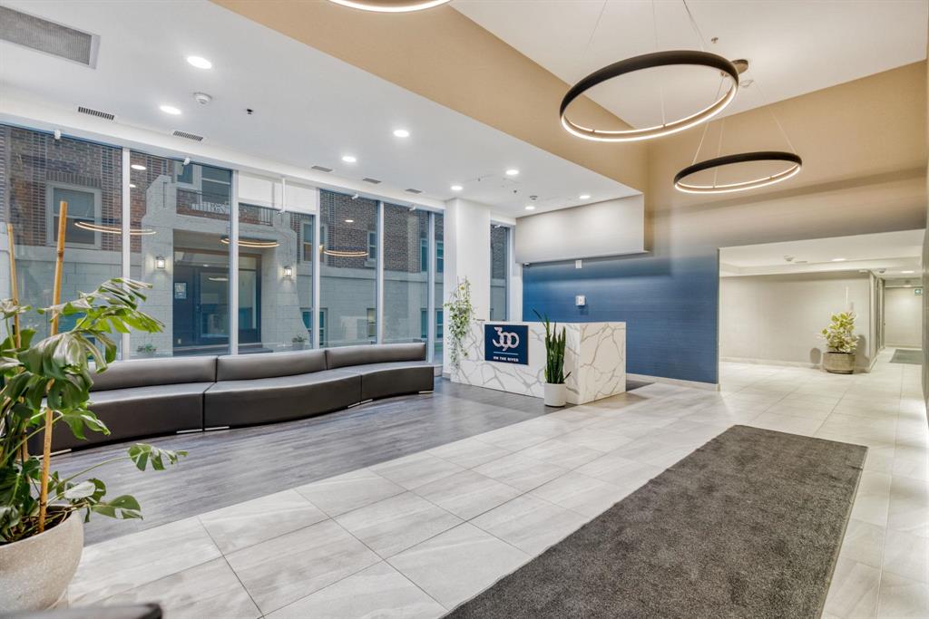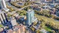 Step into the pulse of downtown. This modern 2 bed/2 bath, 967 sqft condo puts you right where the city comes alive, the river walk, the arena, the restaurants, the nightlife, all at your doorstep. Inside, the finishes are sleek and elevated: quartz, modern cabinetry, under-mount sinks, and integrated Jenn-Air and Fisher Paykel appliances. Bright open living, in-suite laundry, and a true walk-in closet complete the space. The building delivers standout amenities: a 2,364 sqft landscaped terrace with river views, a polished lounge with fireplace and pool table, a full fitness studio, dramatic two-storey lobby, above-grade heated parkade, guest suite, and a private lit path to the river walk.