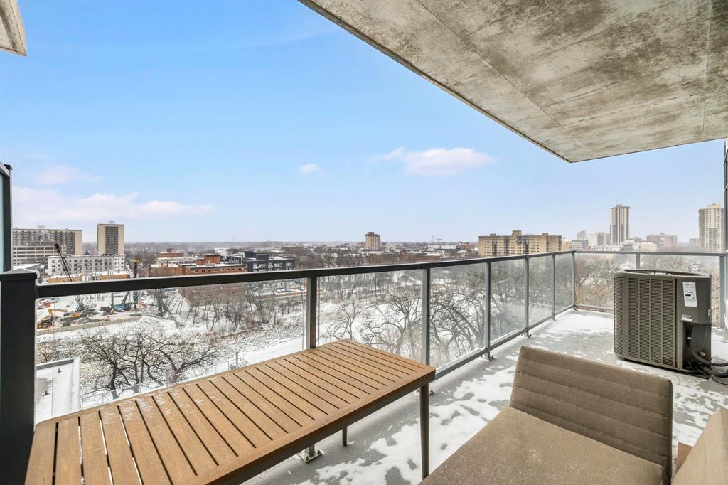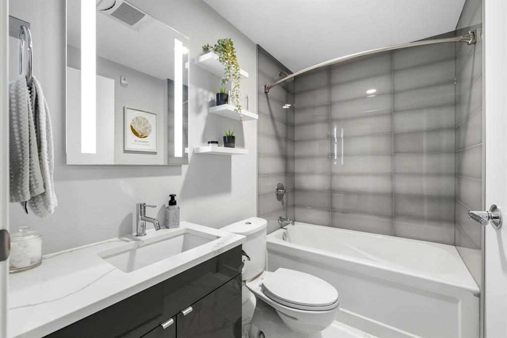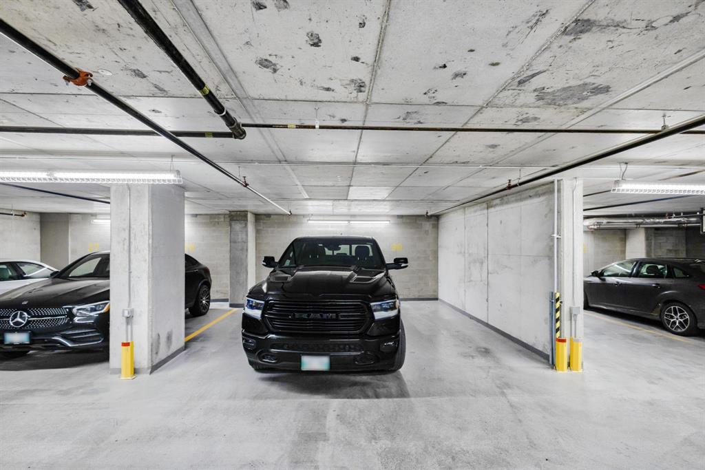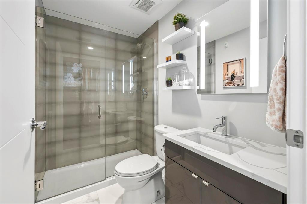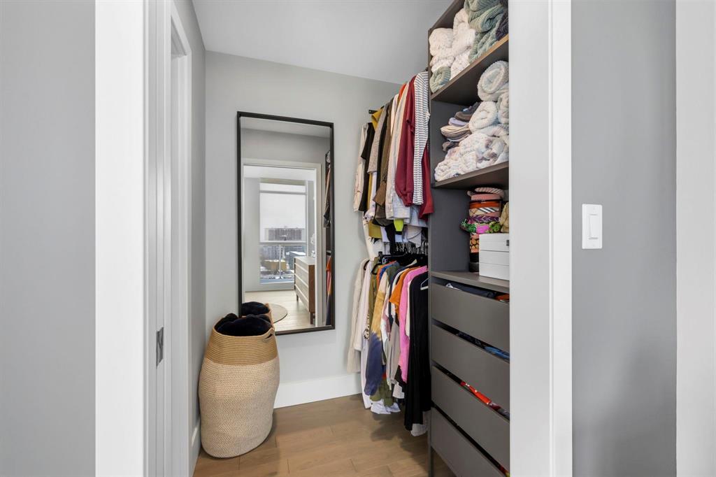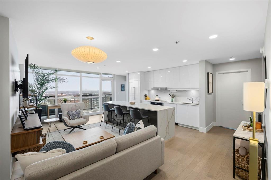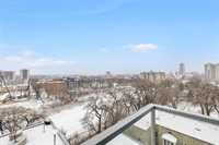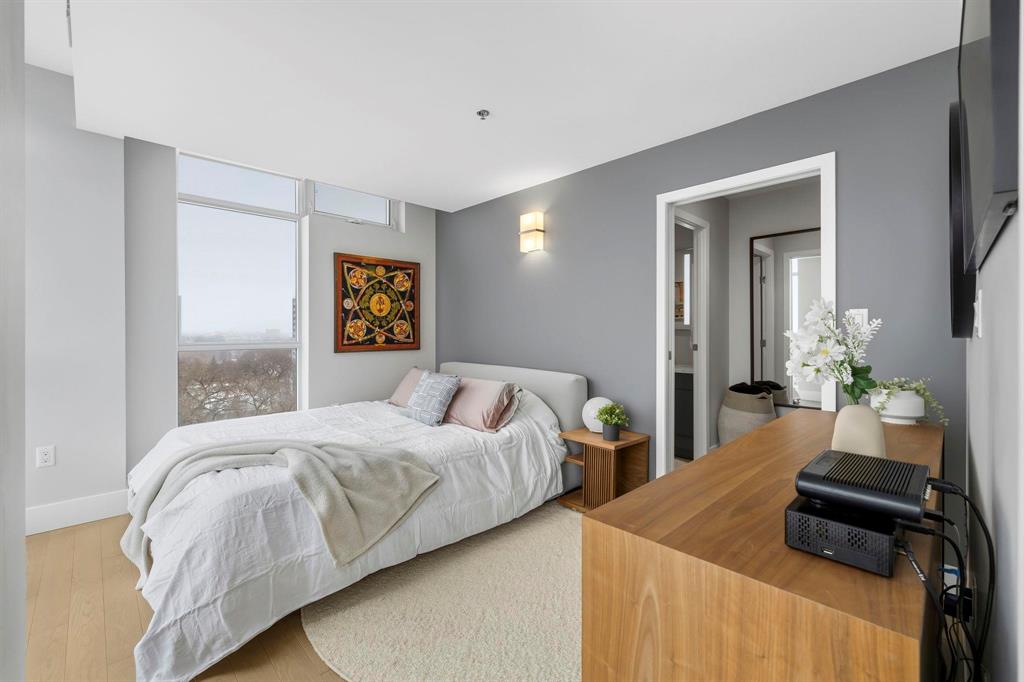 Step into the pulse of downtown. This modern 2 bed/2 bath, 967 sqft condo puts you right where the city comes alive, the river walk, the arena, the restaurants, the nightlife, all at your doorstep. Inside, the finishes are sleek and elevated: quartz, modern cabinetry, under-mount sinks, and integrated Jenn-Air and Fisher Paykel appliances. Bright open living, in-suite laundry, and a true walk-in closet complete the space. The building delivers standout amenities: a 2,364 sqft landscaped terrace with river views, a polished lounge with fireplace and pool table, a full fitness studio, dramatic two-storey lobby, above-grade heated parkade, guest suite, and a private lit path to the river walk.