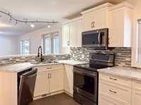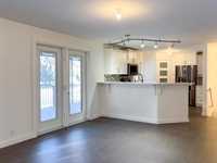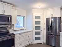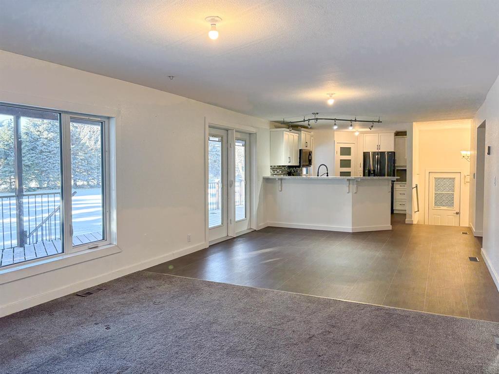 The main floor offers an inviting open-concept layout featuring a bright white kitchen with tiled backsplash, corner pantry, and peninsula that flows seamlessly into the living room. The adjoining dining area opens through garden doors to a covered front verandah. The primary bedroom, with direct access to a private back deck and a 4pc ensuite with jacuzzi tub, a second bedroom, and an additional 4pc bathroom complete the main level.