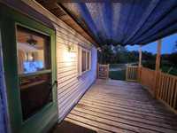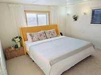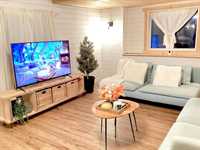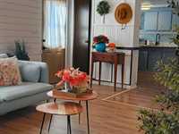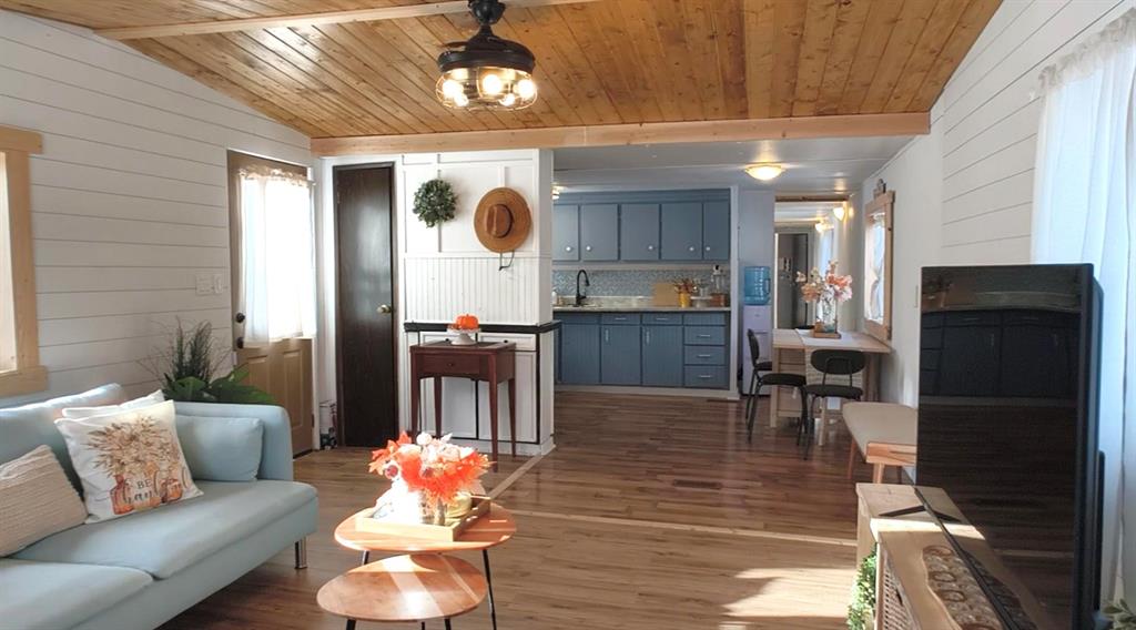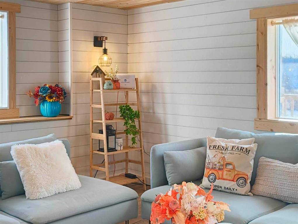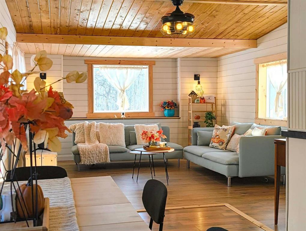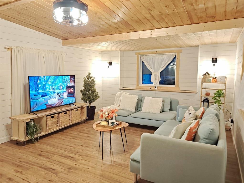 • Renovated living room (‘25) with pine ceiling, white shiplap walls, oak laminate flooring, updated lighting, and remote-controlled ceiling fan