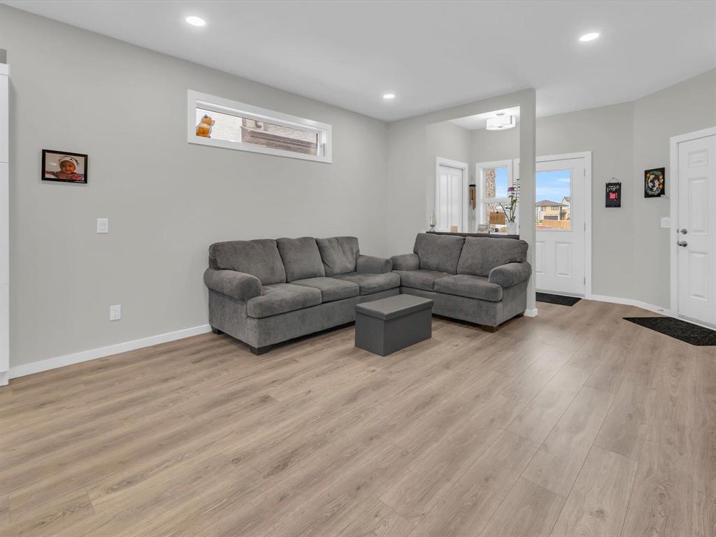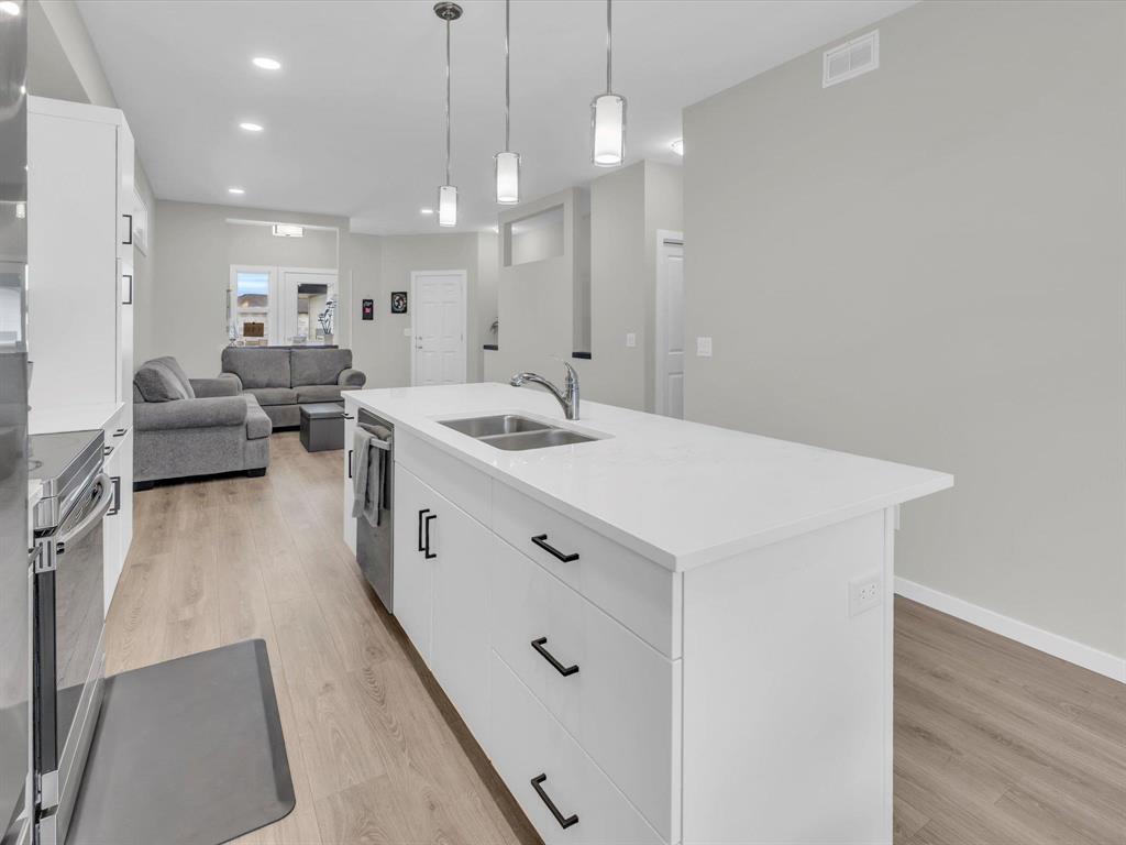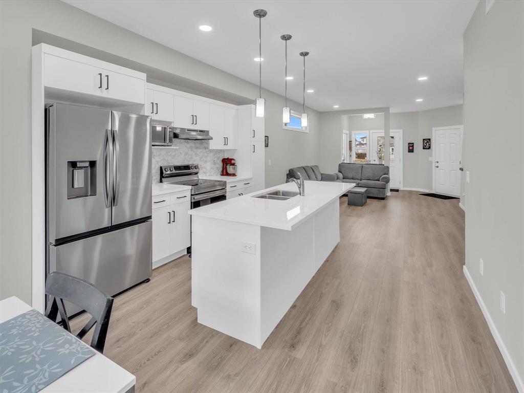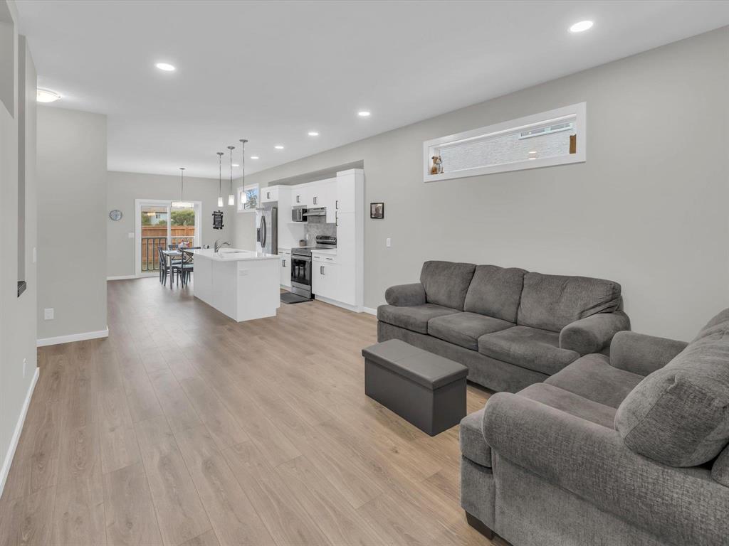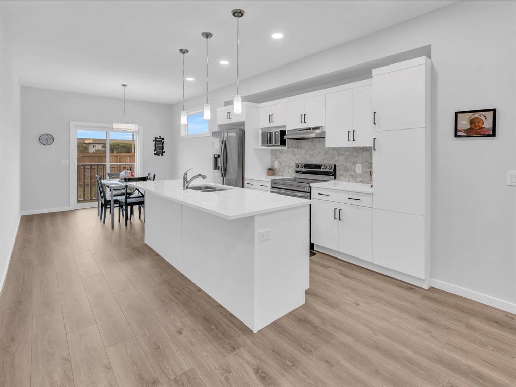 Located in BISON RUN, one of Winnipeg’s fastest-growing neighborhoods, this modern 3 Bed, 2 Full Baths, and a bright open-concept layout with 9’ ceilings and upgraded vinyl plank flooring throughout. Step inside to the spacious great room, flowing seamlessly to the kitchen featuring quartz countertops throughout, large island with bar seating, pendant lighting, LED disc lights, tall pantry, and brand new appliances. At the back of the home, the dining area is highlighted by a piano window and sliding patio doors, filling the space with natural light. The primary bedroom includes a full ensuite with quartz countertops and a standing shower with glass doors. Both bathrooms feature quartz countertops for a clean, modern finish. Other upgrades include: 200 Amp panel, central A/C, gas rough-in for range & BBQ, Hardie siding, poured sidewalk & driveway. The basement is ready to develop—with plumbing for a future full bathroom, 4 egress windows, and ample space for 1–2 bedrooms plus a rec area. Built on piles and still covered under new home warranty, 5 mins to the UofM, close to all levels of schooling, shopping centers, parks and so much more!!