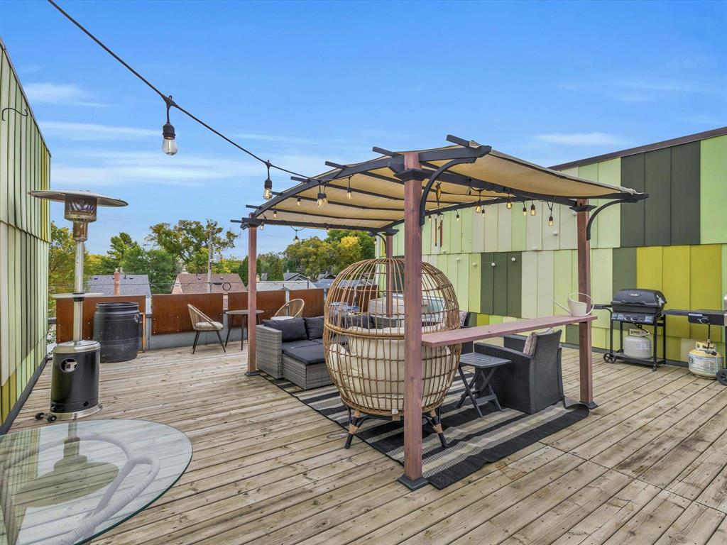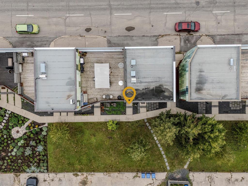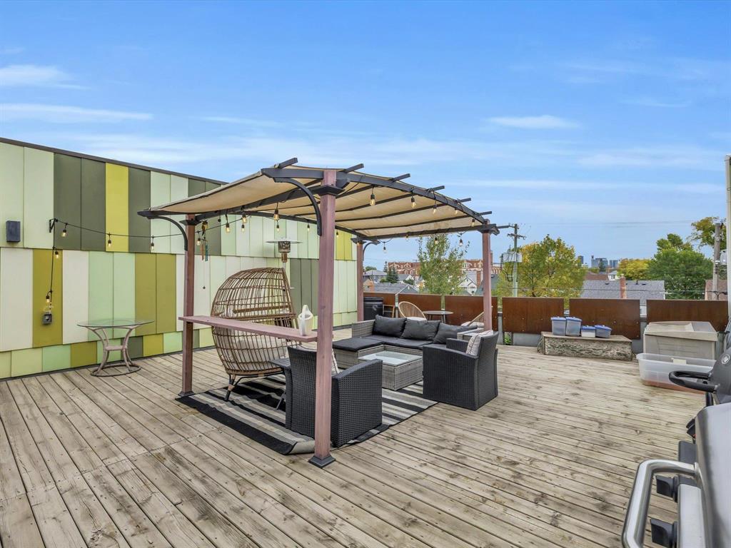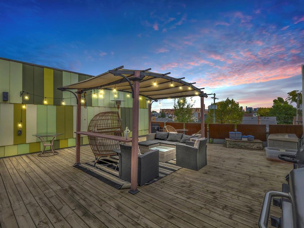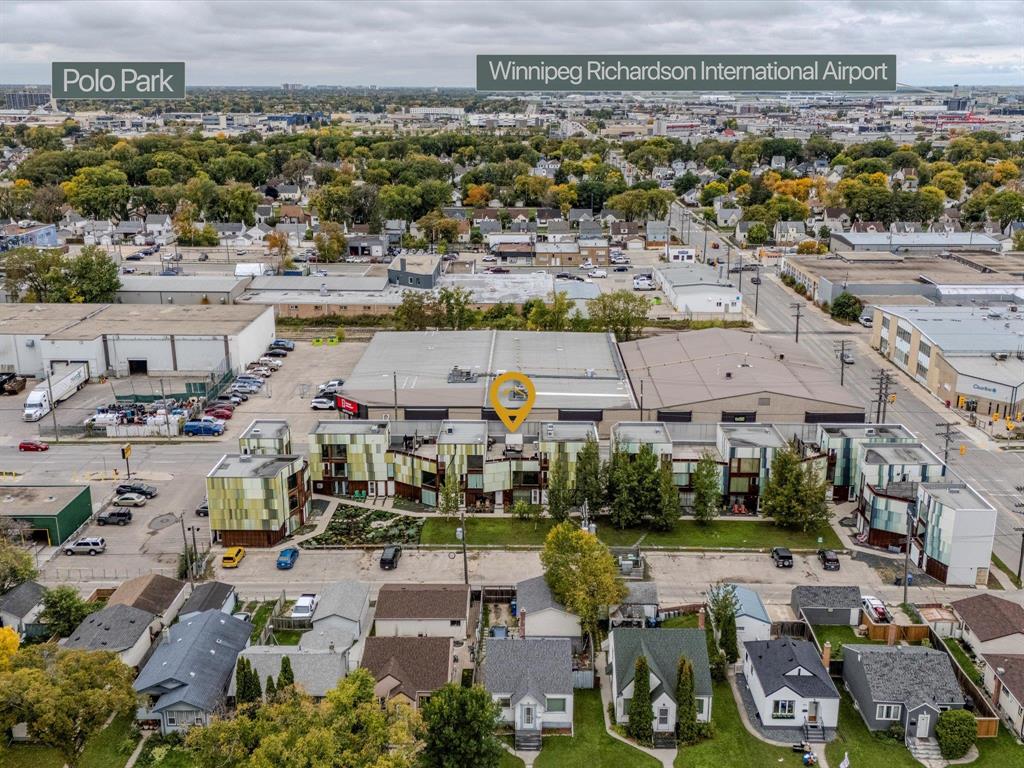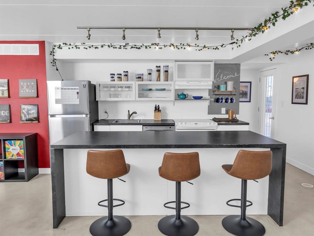 Showings start NOW! Offers anytime. Be ready to be blown away! Live it up in elegance, simplicity and modern style over multiple floors. Huge windows from top to bottom makes the open concept layout even more stunning and bright. Galley foyer upon entrance. A kitchen that would get anyone excited to wield a spatula. Large eat-in island with waterfall countertop makes for an amazing place to cook and entertain guests. All appliances included. Spacious living and dining areas. Sleek lines, unique lighting and NO carpet! Primary bedroom is on the upper level overlooking the main floor. Four-piece ensuite and laundry. Your very own private rooftop terrace is truly special and one of only two in this complex. The perfect place to unwind or get the party started! Conveniently located, downtown nightlife, the Exchange & Canada Life Centre are less than 10 minutes away. Close to Polo Park, restaurants and local shops. Fees include all utilities. Move-in ready! Call today!