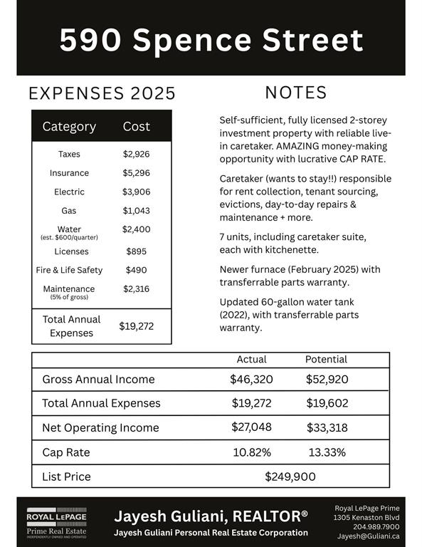 Do you like making money? - $46,320 GROSS, 10.82% CAP. Potential for $52,920 GROSS. This highly profitable, self-sufficient, fully licensed investment property in the West End, just mins from the University of Winnipeg, might be exactly what you’re looking for. With 7 units and a reliable live-in caretaker already in place, this is truly a hands-off ownership opportunity. Current caretaker is a jack-of-all-trades who takes immense pride in the property, its tenants, & the neighbourhood. They're responsible for rent collection, tenant sourcing, evictions, day-to-day repairs & maintenance, successful fire safety inspections, & more (and would like to stay). Each unit has its own kitchenette, with shared bathrooms. Plus a 3 bed, 1 bath separate caretaker suite. Backyard is fenced with a secure, gated parking area. The existing tenants have been carefully selected, resulting in a respectful and safe living environment. Recent upgrades incl furnace (25) & 60-gallon water tank (22), both with transferrable parts warranties. If you're looking for a cash-flowing property with a trusted caretaker and a proven track record, this one delivers. Seller open to 2 year vendor financing for the right buyer.