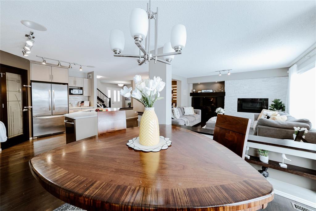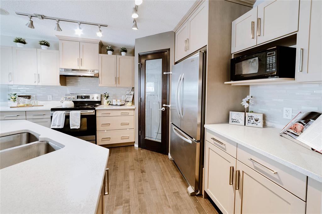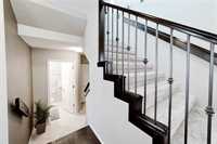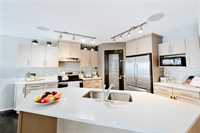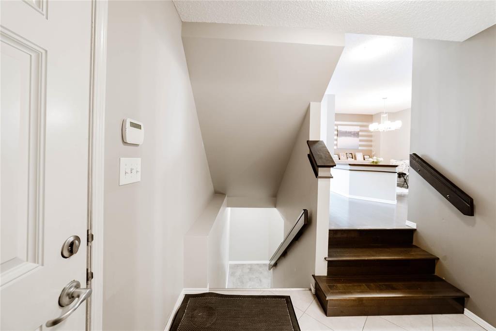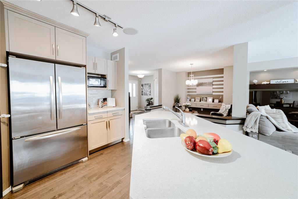 Offers Anytime. Step into this stunning 1,760 sq. ft. luxury townhouse condo featuring 3 bedrooms, 2 full and 2 half bathrooms and a double attached garage. This former Randall show home is packed with upgrades, including a new hot water tank and blends style with comfort. Maple hardwood floors, an open-concept layout and abundant natural light create a welcoming atmosphere. The kitchen boasts maple cabinetry, quartz countertops, a custom backsplash and a walk-in pantry, flowing into the formal dining area and cozy great room with built-in entertainment unit and stone gas fireplace. Enjoy summer BBQs on the spacious deck overlooking a fully fenced, professionally landscaped yard. Upstairs includes 3 spacious bedrooms, a primary suite with walk-in closet and private ensuite, plus a convenient laundry room. The fully finished lower level provides extra living space and storage—perfect for a rec room, office, or gym. Located in desirable Amber Trails near schools, parks, trails, medical services, shopping, dining and transit. Book your showing now—don’t wait! A rare find—act fast!