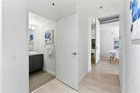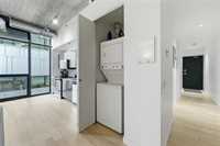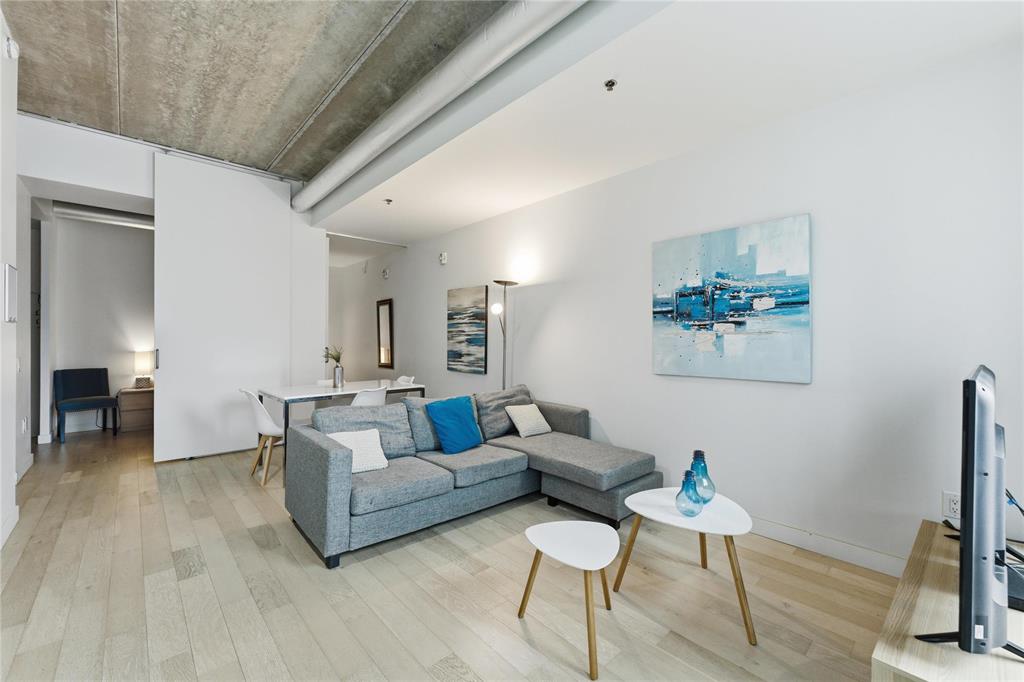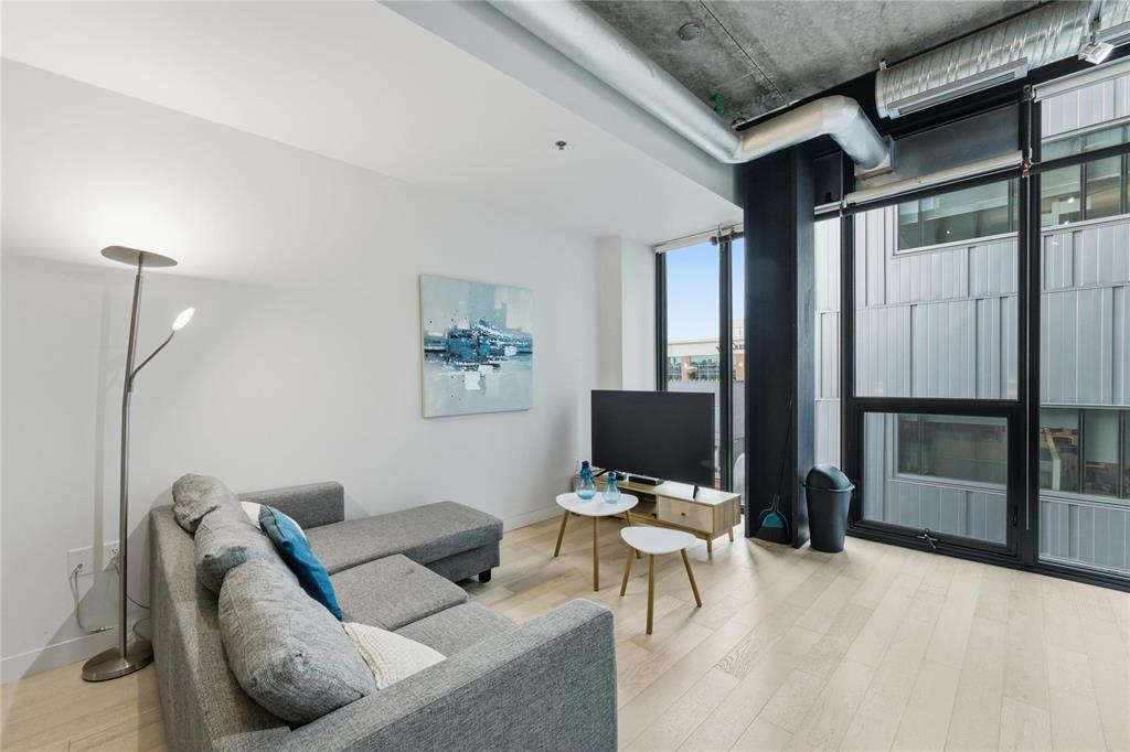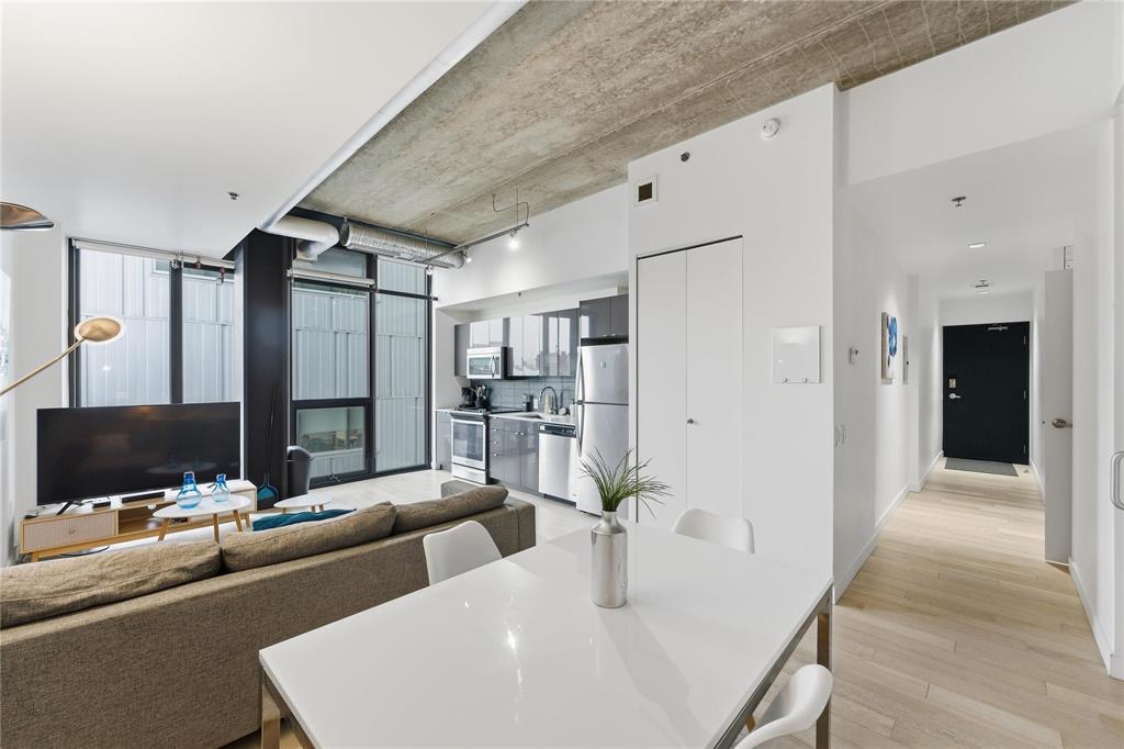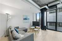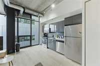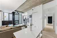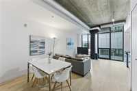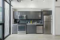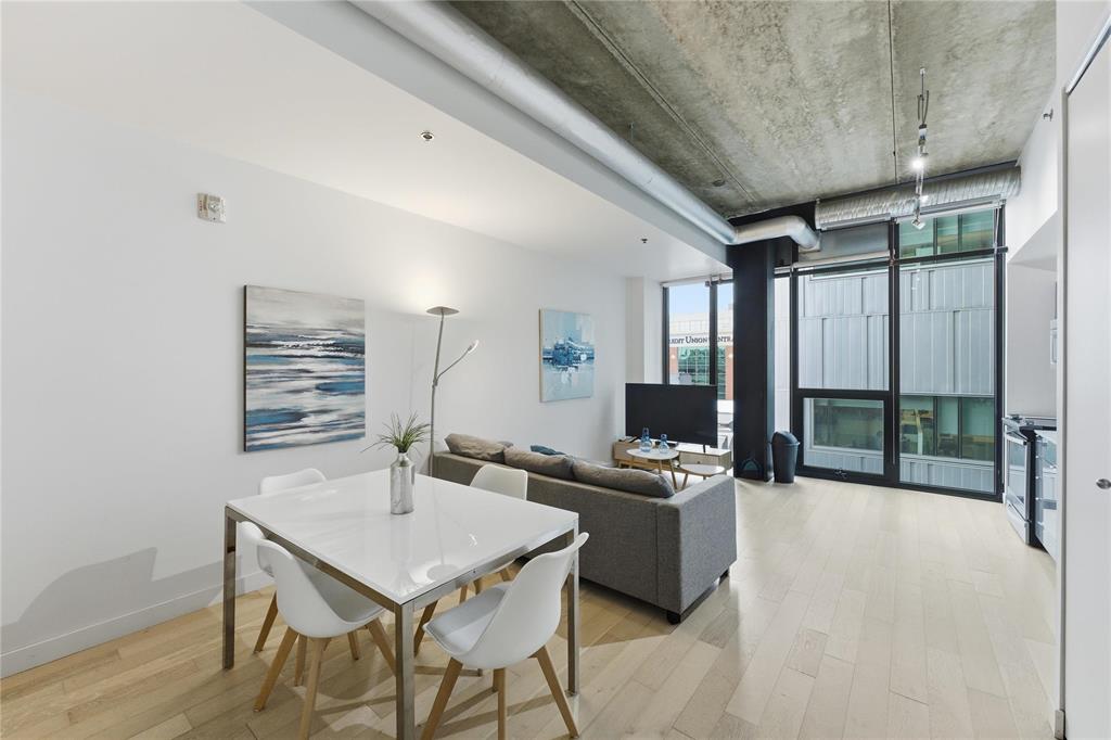 Best value per square foot! This sleek, modern, and sophisticated unit features 10-foot ceilings and an open-concept layout that feels bright and spacious. Floor-to-ceiling windows flood the space with natural light, highlighting the high-gloss espresso cabinetry, quartz countertops, and industrial-style concrete ceilings. Clean lines and thoughtful design create a streamlined, functional living space with everything you need.