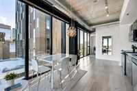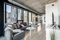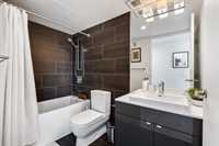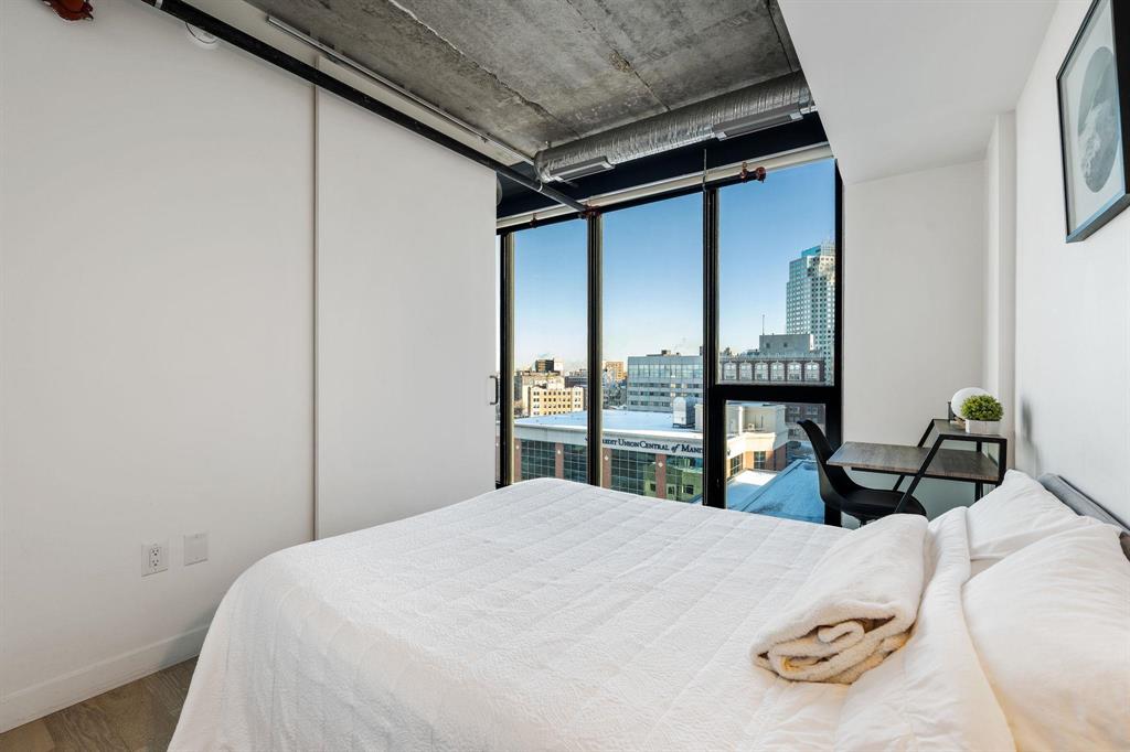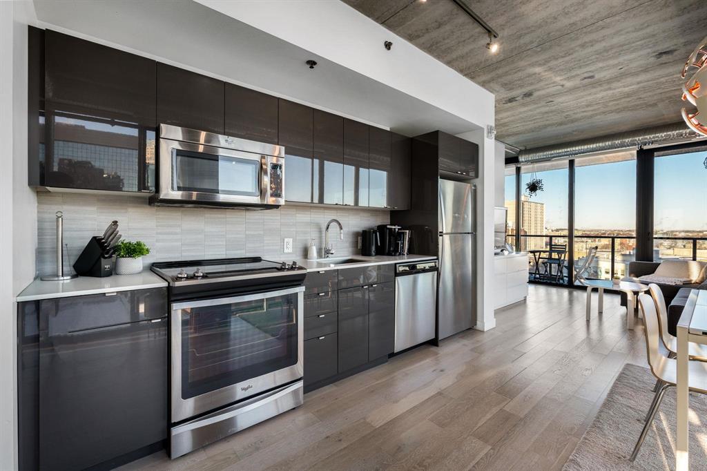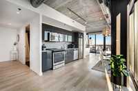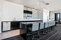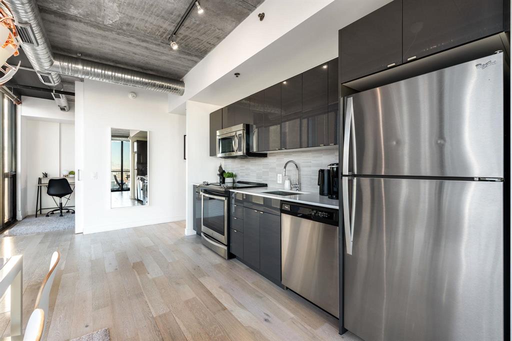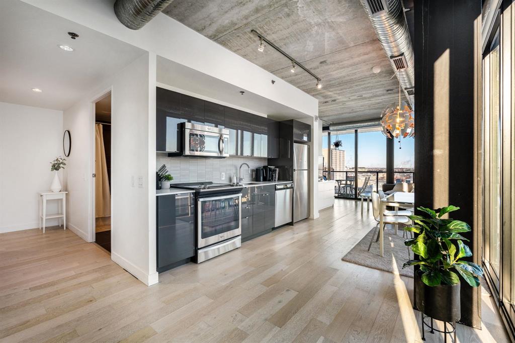 S.S now. Enjoy elevated urban living in this stylish 2-bedroom, 2-bathroom, 822 sq ft condo located on the 10th floor in the heart of downtown. Expansive panoramic windows maximize natural light and showcase impressive city views, creating a bright and modern atmosphere throughout. The open-concept living and kitchen area offers a clean, contemporary design with soft-close cabinetry and quartz countertops. The smart split-bedroom layout provides excellent privacy, with the primary suite featuring a deluxe ensuite and stunning skyline views, while the second bedroom is equally bright and inviting. Both bathrooms are finished with porcelain tile, quartz counters, and sleek modern fixtures. In-suite laundry adds everyday convenience. Additional highlights include pet-friendly living, storage conveniently located on the 5th floor, garbage chutes on every floor, and premium lifestyle amenities such as a private theatre, common lounge with kitchen and pool table, and a spectacular outdoor penthouse patio. Refined, modern city living at its best. Come and experience it for yourself.
