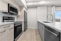 Ask us about our 6-month FREE CONDO FEE rebate. Visit the project website for a full price list & current availability. The show suite is open every Thursday 5-7 PM and Saturday 12-2 PM. Concrete Constructed & now complete with immediate possessions. 90% SOLD. This unit is the most popular as it comes with a large wrap-around patio with glass railings with south west views & includes heated underground parking. The main bedroom has a walk-in closet & 3pce ensuite with a large shower. The open-concept main living area has 9' ceilings, LVP flooring, 2 large windows plus a 6ft patio door to the patio allowing a ton of natural light. The kitchen has quartz countertops including a large peninsula with breakfast bar & ceramic tiled backsplash & under-cabinet lighting. 4 stainless steel appliances are included. In-unit laundry with a stacked washer/dryer included and central air conditioning. Pet-friendly with 2 pets under 55lbs & has a pet wash station and dog run. Located in The Refinery District close to amenities such as the UofM, Princess Auto Stadium & a short walk to Rapid Transit. There is also a bike storage room, fitness room & party room. Pictures of similar unit and may be virtually staged