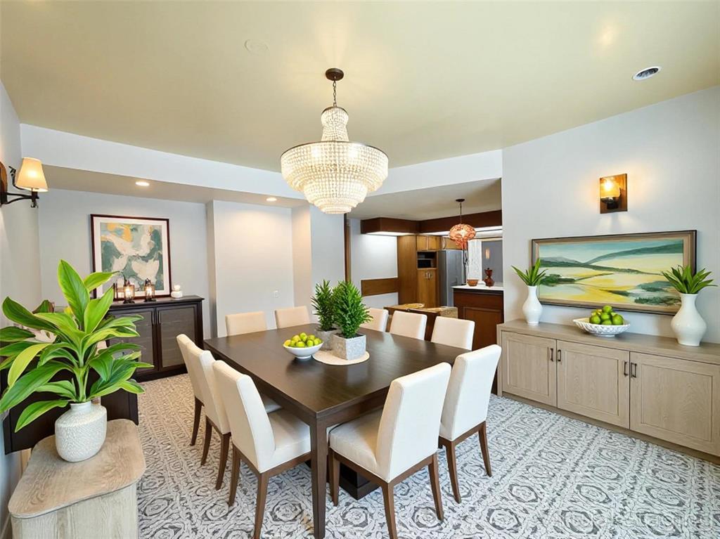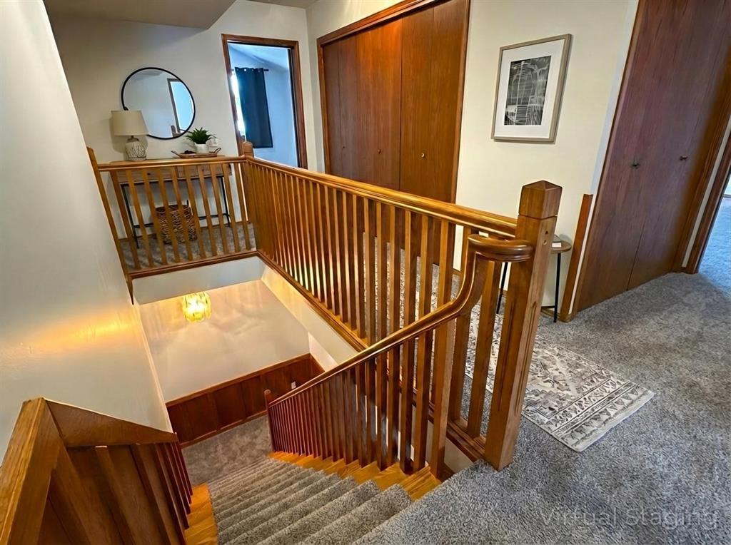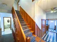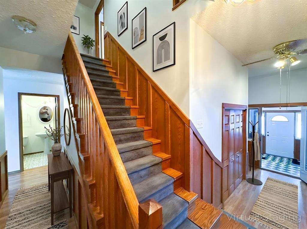 a sunroom, perfect for relaxing or entertaining. A dramatic staircase leads to an upper level with the